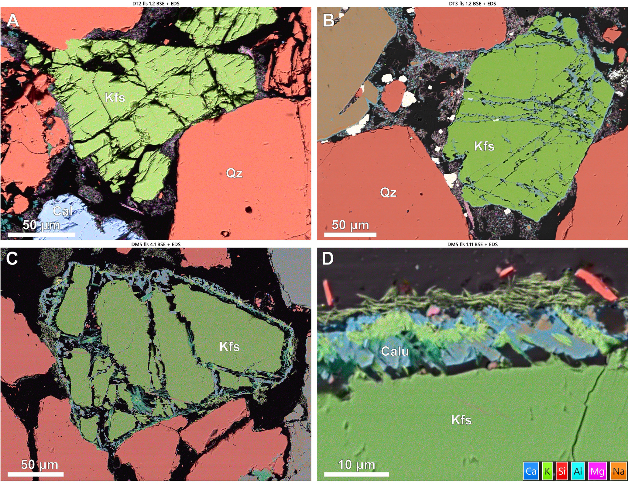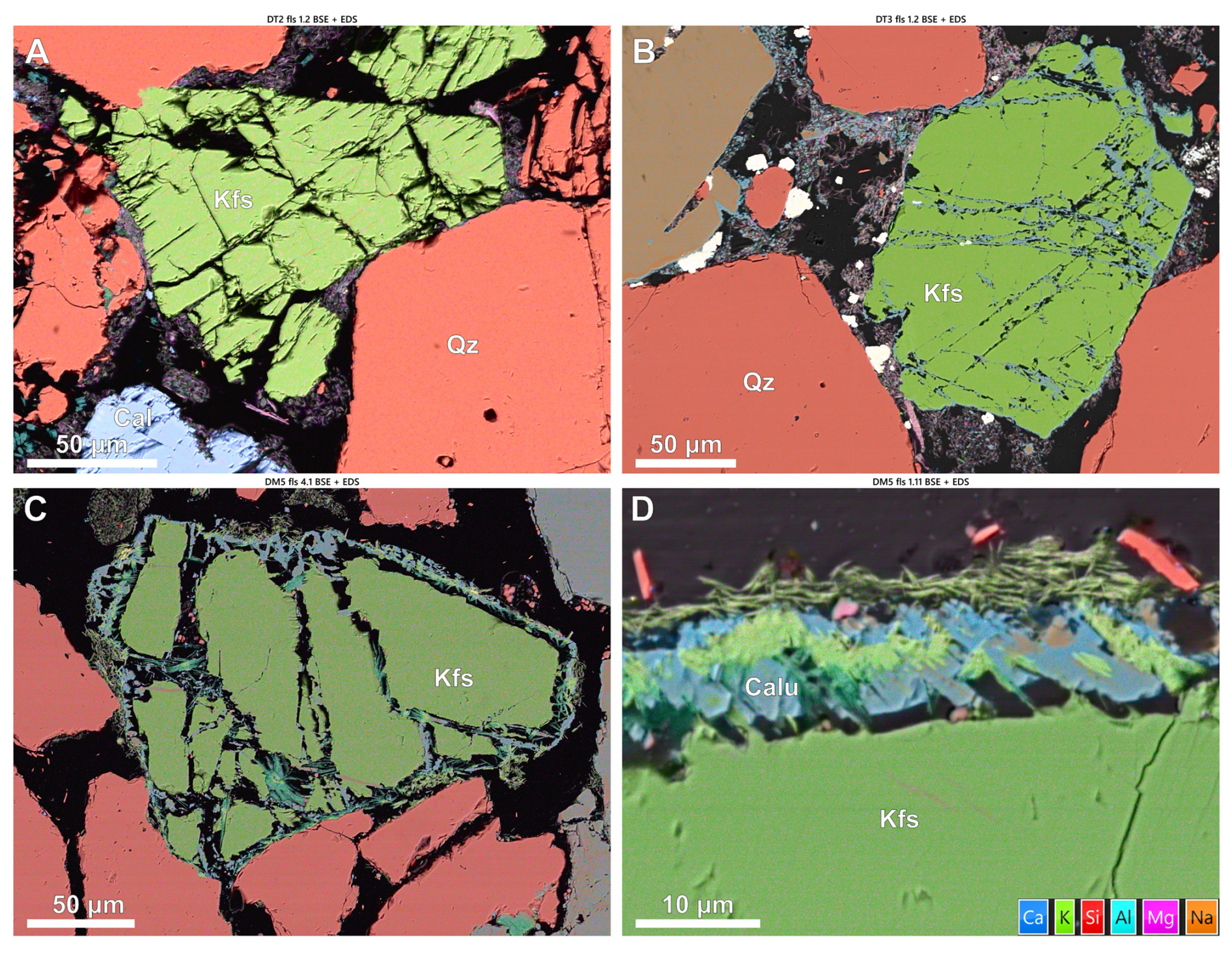 In this study, we observed the replacement of K-feldspar by calcic aluminosilicates i.e. “anorthitisation”, under experimental conditions (400 °C, 70 MPa confining pressure). Anorthitisation has been described in natural systems, e.g. the transformation of andesine to anorthite in the presence of Ca2+-rich meteoric fluids (Mora et al., 2009) and has been described conceptually in the framework of CDP reactions (Putnis, 2009). Though K-feldspar alteration via direct K+- Ca2+ substitution has not been described previously in geological settings, there are natural examples of K-feldspar alteration involving Ca-bearing fluids. These include high temperature hydrothermal systems where K-feldspar is replaced by Na-Ca plagioclase and myrmekite textures form via K, Na, and Ca exchange (Chakrabarty et al., 2023). And low temperature settings in CO2-rich basins like Otway and Bravo Dome where fluid acidification drives feldspar dissolution and precipitation of Ca-bearing phases such as dawsonite and calcic zeolites, (Mora et al., 2009; Wigley et al., 2013; Baines and Worden, 2004).