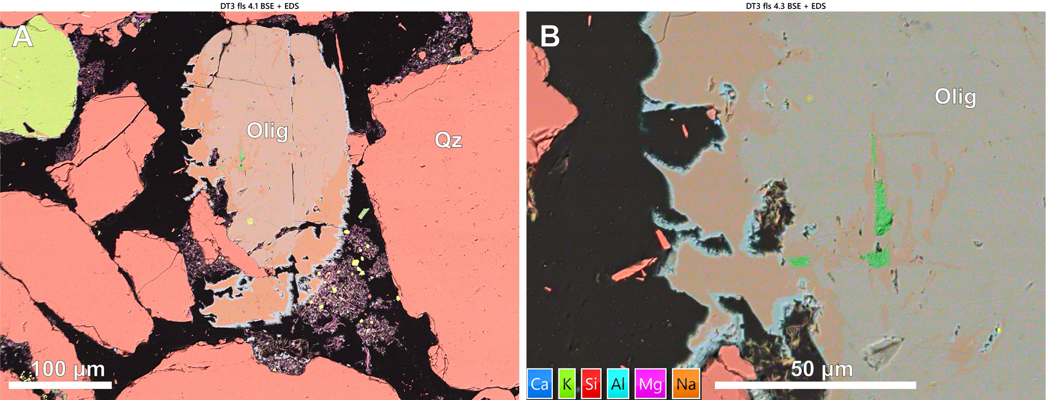 The Captain Sandstone Member contains two types of plagioclase: Na-rich end member albite and intermediate oligoclase (Fig. 2). The impact of CO2 enriched pore fluids on oligoclase and albite, is markedly different to each other. At 80 °C (reservoir temperature) albite grains remain coherent/intact with their original grain boundaries and skeletal textures (Fig. 7A) while oligoclase grains show minor marginal dissolution or “scalloping” along grain edges (Fig. 7B). At 250 °C, oligoclase grains have complex, indented grain boundaries often surrounded by kaolinite and mixed-element fine clays (Fig. 7B and C). Some grains show evidence of intergranular pore development or surface etching, though intergranular microfracturing is limited or absent. At higher temperatures (> 400 °C), intergranular porosity in oligoclase increases due to grain dissolution (Fig. 7E and F). Albite grains also show significant intergranular porosity, though this appears consistent with the skeletal textures observed in pre-experiment sandstones (Fig. 7D).