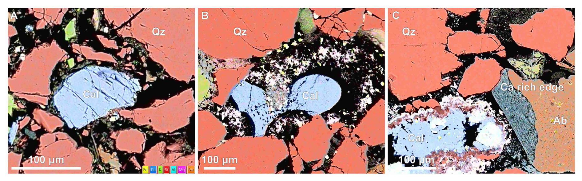 Previous studies on the Captain Sandstone “D sand” also observed calcite dissolution during CO2 flow-through experiments at < 60 °C (Hangx et al., 2015). However, this study focused on the effect of calcite dissolution on rock mechanical strength and, although they also noted K-feldspar dissolution, did not examine the coupled mechanisms driving geochemical alteration or potential for ion exchange.