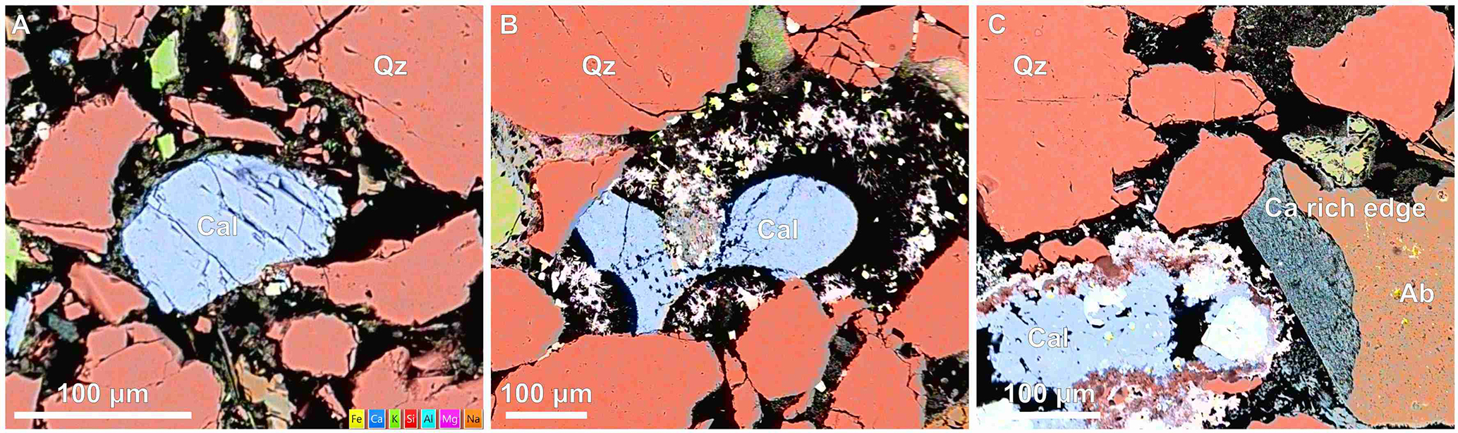 Experiments run with H2O pore fluids show no obvious chemical alteration of albite or oligoclase at experiments conducted at 400 °C and below, but in these samples the oligoclase grains do show more intergranular fractures with many grains fractured along cleavage planes (Fig. 9A). At higher temperatures (550 °C) some oligoclase grains show chemical dissolution and “scalloping” of the grain boundary (Fig. S12) with few grains exhibit a thick, porous texture calcite overgrowths apparently tracking the original grain boundary as this boundary abuts the contact with quartz grains (Fig. 9E and F). In this sample calcite cements are still present as singular, isolated patches of cement (Figs. 10C and S13).