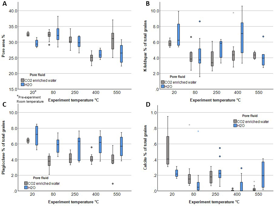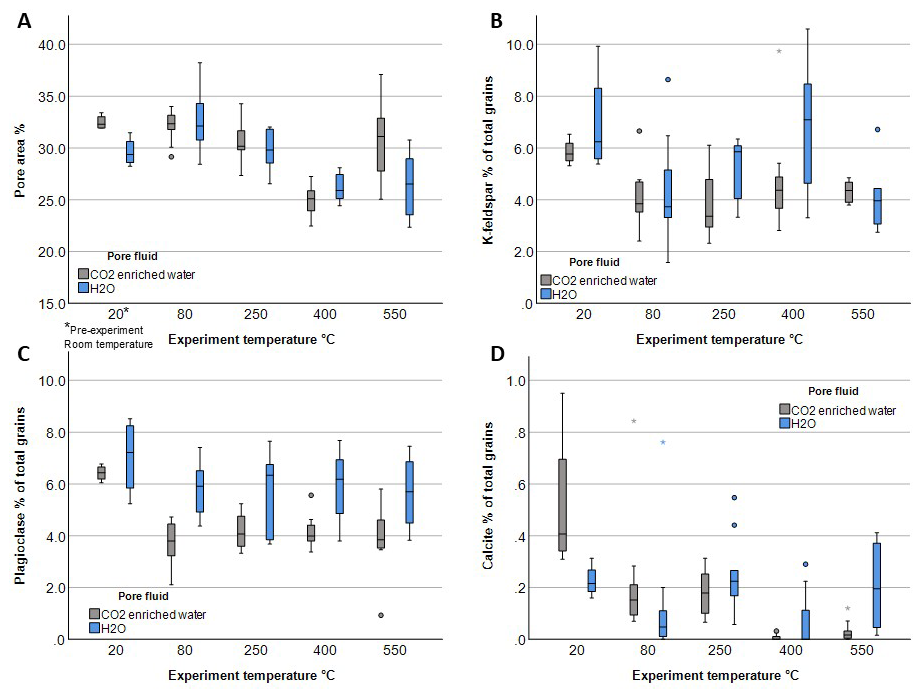Boxplots show the percentage of reactive grains (K-feldspar, plagioclase, and calcite) expressed as their proportion relative to the total number of mineral grains visible in each image (Fig. 1B–D). The average proportion of K-feldspar grains decreased by nearly half in all samples exposed to H2O and CO2, with a more significant reduction observed in post CO2 experiment samples (Fig. 1B). These CO2 reacted samples also exhibited a more heterogeneous distribution of K-feldspar, as indicated by the wider interquartile ranges on the grey CO2 box-and-whisker plots compared to the blue H2O boxes, suggesting variable dissolution across the sample (Fig. 11B). Due to limitations in image thresholding, albite and oligoclase were grouped together under the category of “all plagioclase”. In samples reacted with CO2, the proportion of plagioclase decreased by approximately 25 %, indicating some dissolution. In contrast, H2O-reacted samples show little change in plagioclase area (Fig. 11C). XRD analysis determined ∼ 1 % calcite in the pre-experiment samples (Table S1), observed in thin sections as carbonate clasts, bioclasts, and carbonate cement patches (Fig. S4). Quantitative image analysis showed low area fractions of calcite across many pre- and post-experiment images (0 %–0.9 %). Pre-experiment samples had median calcite area fractions of 0.2 % and 0.4 %, whereas post-experiment samples generally showed lower median values. In CO2-reacted samples, calcite abundance decreased by more than half at 80 and 250 °C, with calcite nearly absent at 400 and 550 °C (Fig. 11D). In contrast, H2O-reacted samples showed only a slight decrease at 80 °C, with calcite contents remaining largely unchanged at higher temperatures.