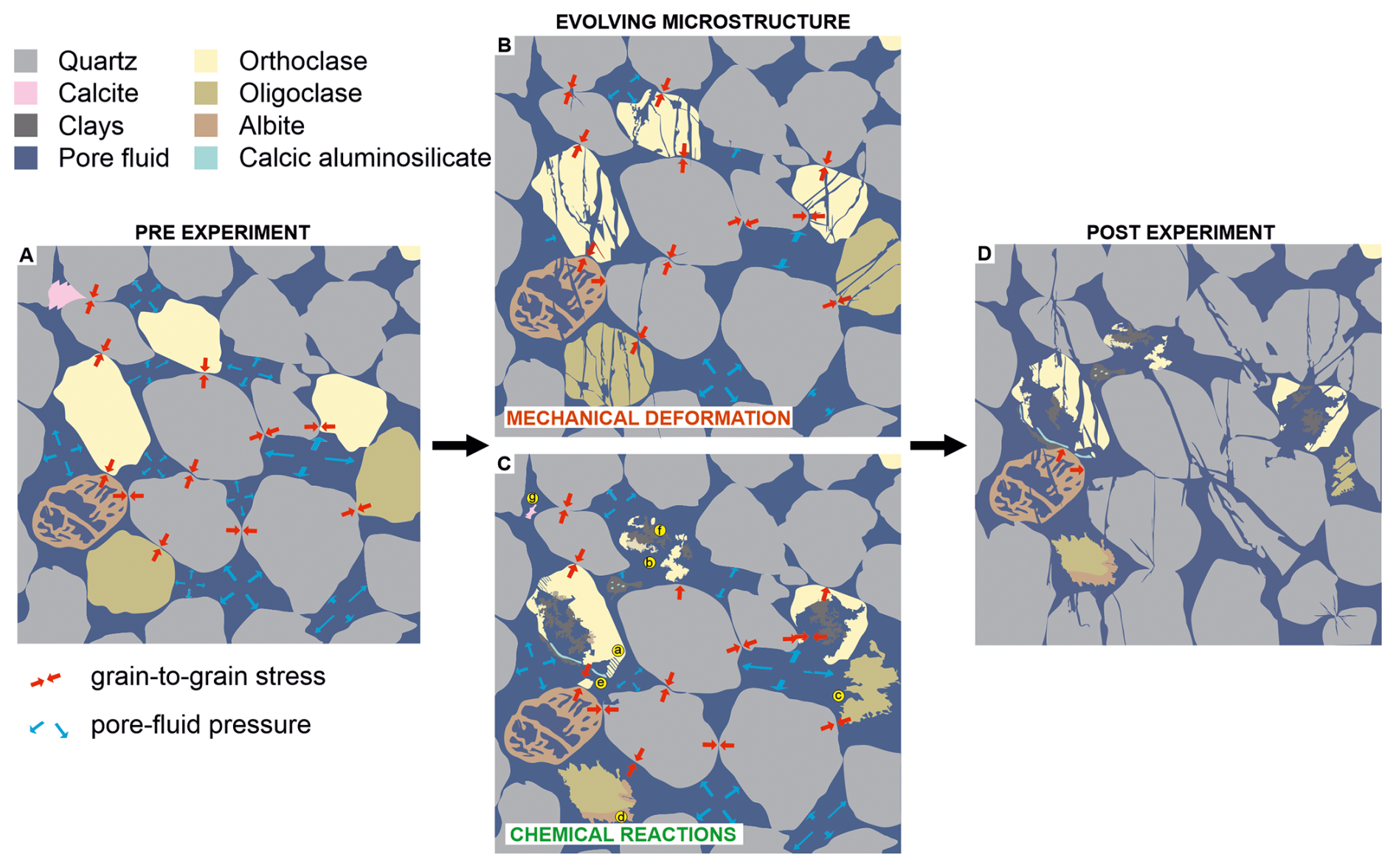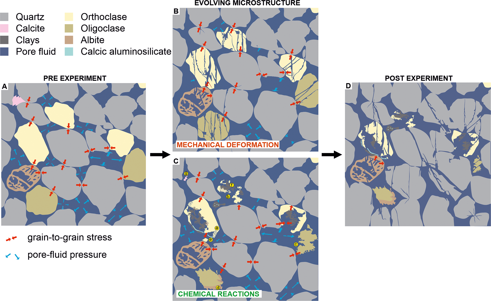 Figure 12Schematic summary of the coupled mechanical and chemical changes identified from hydrostatic batch experiments using CO2-enriched pore fluids on the Captain Sandstone (“D sand”). Experiments were conducted at reservoir-relevant confining and pore fluid pressures, generating grain to grain scale stresses at temperatures of 80–550 °C. These conditions promote interacting mechanical and chemical feedbacks that drive the evolution of sandstone microstructure and texture. (A) Pre-experimental sandstone texture with intact K-feldspar (orthoclase), calcic plagioclase (oligoclase), skeletal albite, and minor calcite cement. (B) Mechanical deformation preferentially fractures feldspars relative to quartz, creating fresh reactive surfaces and increasing feldspar–fluid contact. (C) Chemical reactions include (a) orthoclase dissolution expressed as parallel cracks penetrating from grain margins to interiors, (b) orthoclase grain dissolution, (c) oligoclase dissolution, (d) albitisation of oligoclase, (e) precipitation of calcic aluminosilicate, (f) precipitation of clay minerals (muscovite–illite), and (g) dissolution of calcite cement. (D) Post-experiment analysis illustrates how coupled deformation–dissolution and new mineral precipitation reshape the microstructure.