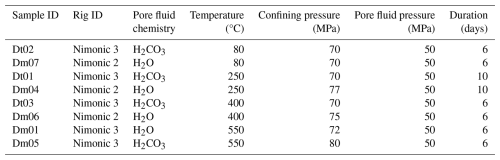 Eight reaction experiments were performed on 9.5 mm diameter core plugs of Captain Sandstone Member “D sand” using hydrostatic pressure vessels at ∼ 70 MPa confining pressure (Pc) aka ∼ 3 km burial depth with 50 MPa pore fluid pressure (Pf). Four experiments used CO2 saturated water as a pore fluid (as a proxy for CO2 injection), while four control experiments used H2O under the same conditions. We experimentally modelled the progression of feldspar reactivity under subsurface conditions by conducting experiments across a range of temperatures (from 80 °C, aka reservoir conditions, up to 550 °C), using elevated temperatures as a proxy for longer reaction time. This approach uses the Arrhenius equation, which describes the temperature dependence of reaction rates, allowing higher temperatures to accelerate mineral reactions and simulate longer-term geochemical processes within practical and repeatable laboratory timescales (calculated reaction rate ratios for these experiments detailed in the Supplement). These results can then be extrapolated to reservoir temperatures following standard practice in mineral-reaction studies (Blum and Stillings, 1995), a methodology commonly used to model reservoir evolution over geological timescales (Brantley et al., 2008; Hangx and Spiers, 2009; Hellmann et al., 2012). Experimental conditions are detailed in Table 1.