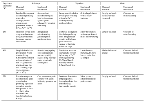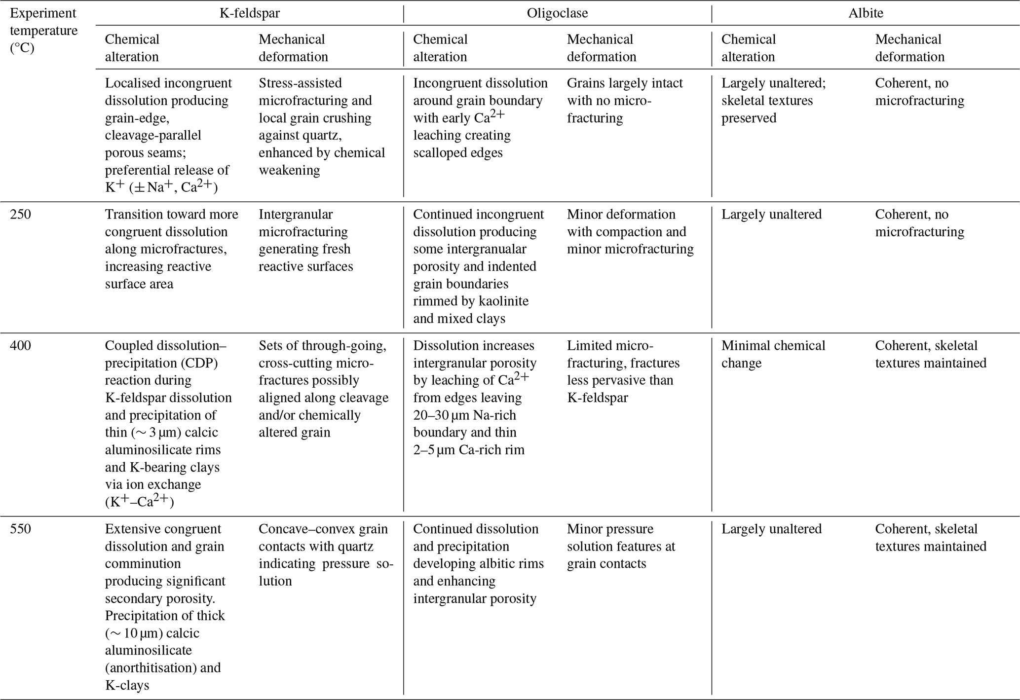 At 80 °C, open pores develop on grain surfaces as linear and parallel “cracks” or “seams” that propagate into grain interiors at high angles, often forming bimodal cross-cutting sets aligned with cleavage planes (Figs. 4A and B, S5 and S6) and commonly oriented with albitised lamellae (Fig. 5A). Some tightly packed K-feldspars are fractured against adjacent grains and crushed between quartz grains, which remain largely intact, suggesting mechanical weakening of stressed K-feldspars, likely enhanced by localised dissolution and development of porous “seams” on the grain edges (Fig. S5). At 250 °C intergranular dissolution becomes more pronounced, suggesting that increased intergranular fracture density both enhanced reactive surface area and created conduits for further fluid-rock interaction (Fig. 4C). At 400 °C, K-feldspar dissolution is accompanied by the formation of thin (∼ 3 µm), discontinuous calcic aluminosilicate overgrowths along open grain boundaries, particularly around smaller K-feldspar fragments (Figs. 4D and 5B). EDS spot analysis shows overgrowths are chemically equivalent to calcic plagioclase (andesine- anorthite) (Fig. S17). At 550 °C, intergranular fractures widen (5–10 µm vs. < 5 µm at 400 °C), and K-feldspars are segmented by cross-cutting fractures into fragments with rounded, dissolution-modified edges (Fig. 4E and F). In this sample secondary porosity is widespread and these pores can often be identified by “ghosts” of former grain outlines defined by secondary clay precipitates (Figs. S6–S8 and XCT images and animations, https://doi.org/10.6084/m9.figshare.30061294.v1, Farrell et al., 2025).