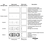 Juvenile stage. At the macroscale, crescent-shaped fractures are well defined and develop topographic relief. Succeeding impacts cause crescent-shaped fractures to penetrate deeper into the curling stone, and a localised damage zone develops in the collet zone between the striking band and the crescent-shaped fractures. At the microscale, the crescent-shaped fractures widen to become through-going microfaults with gouge and continue to propagate at the margins of the fractures and into the stone. The damage zone consists of interconnected transgranular fractures.