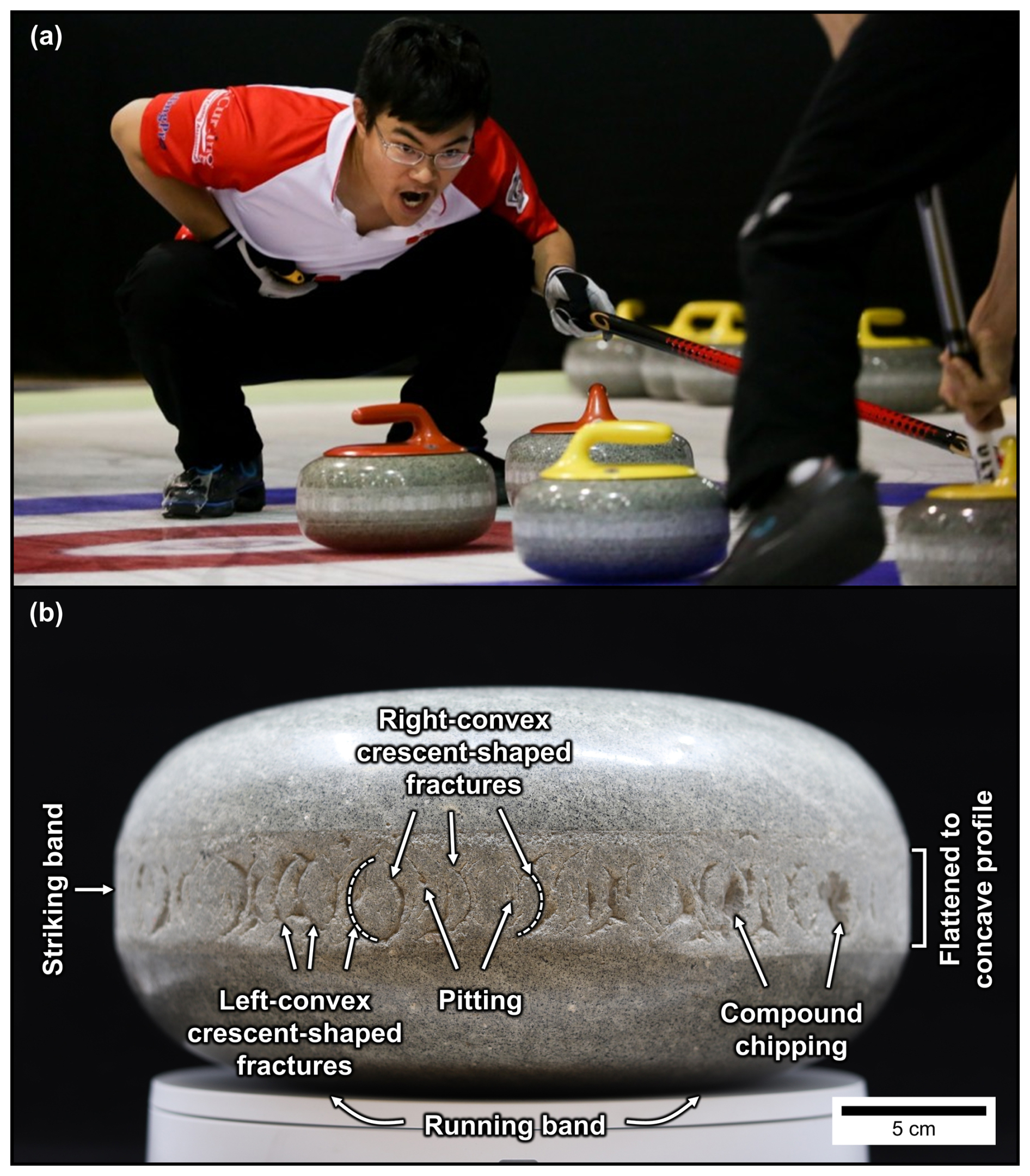 Figure 1(a) Curling stones collide with one another during a game (© 2017 World Curling Federation/Céline Stucki). (b) These collisions cause the accumulation of damage in the circumferential striking bands of curling stones, which manifests as crescent-shaped fractures, flattened to concave profiles, pitting, and compound chipping.
