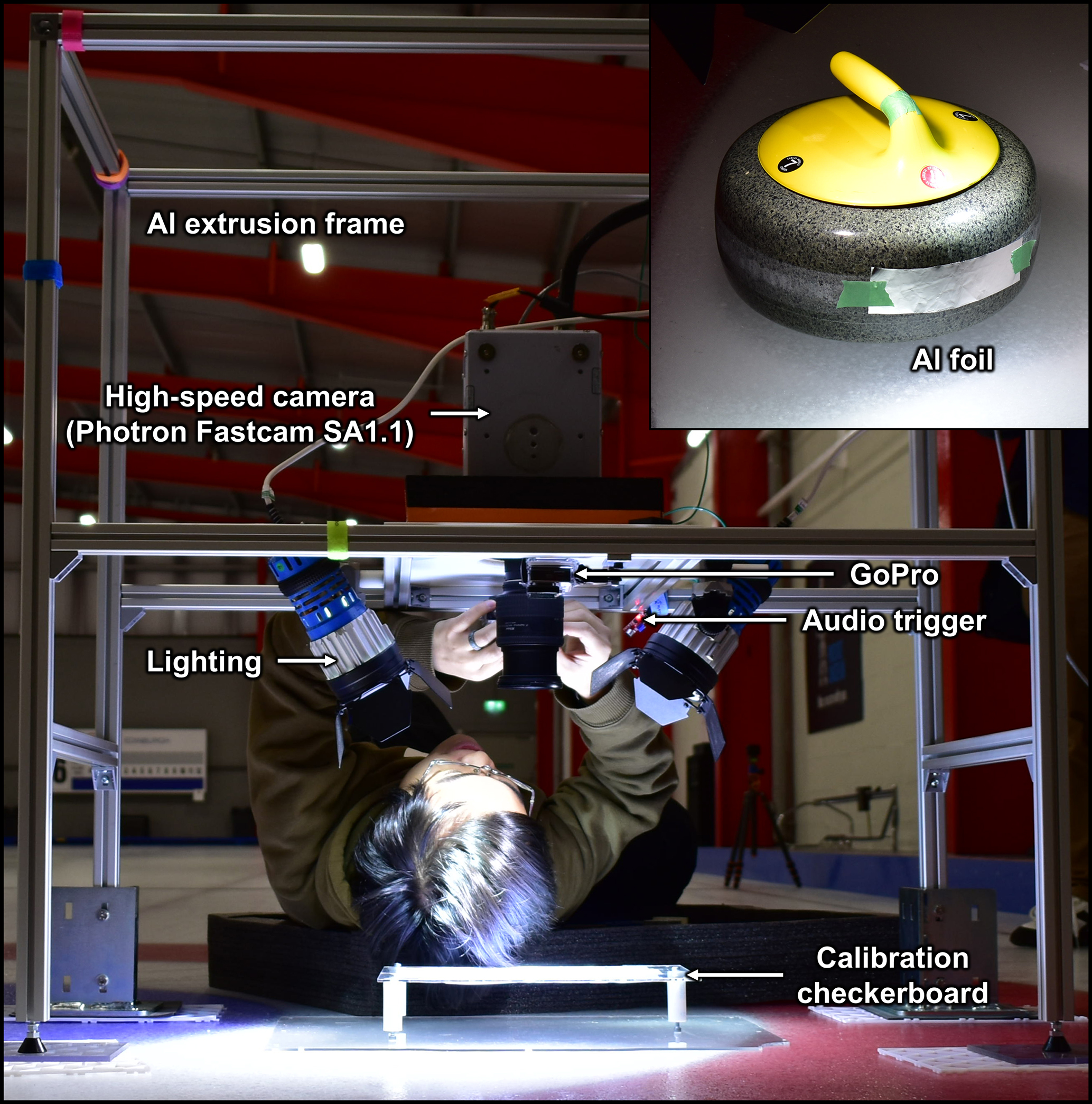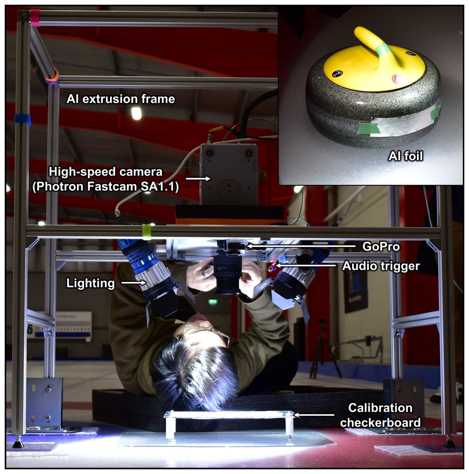 Aluminium foil and pressure-sensitive film (Fujifilm HHS) were taped onto the striking bands of the stationary curling stone to determine the contact area and pressure distribution of the collisions. These films were subsequently scanned using a document scanner at 600 dpi, and the contact area and dimensions (i.e., width and height) were measured visually via Fiji (Schindelin et al., 2012).