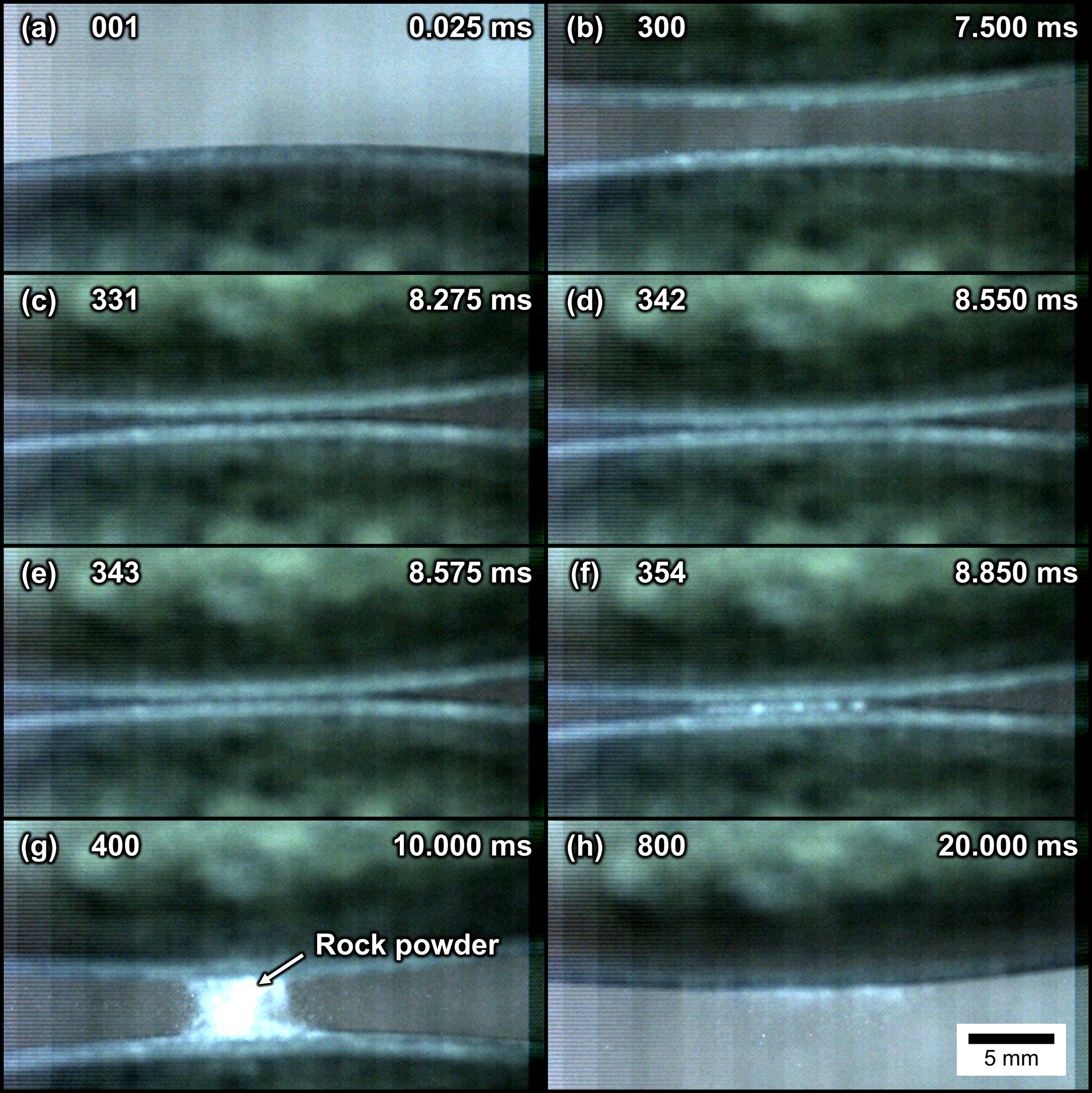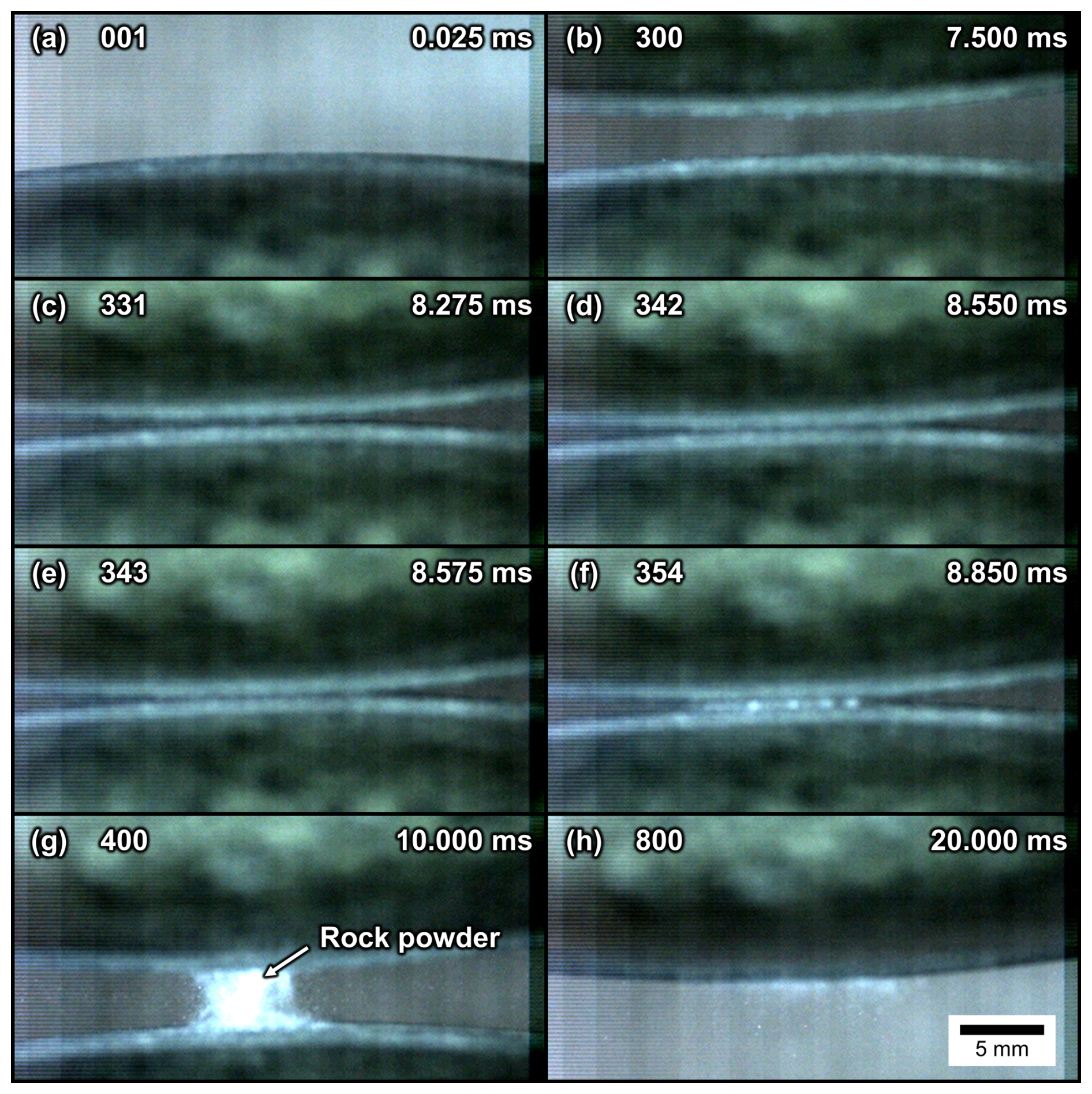 Figure 3 shows a sequence of high speed camera frames depicting one of the collisions (Exp. 2.13), with the stationary stone visible at the bottom edge of the frames. For a radial impact velocity of the contact time was found to be frames (frames 331–354) at 40 kfps or . Frames 354 and 400, which capture the separation of the two stones, show that the collision also leads to the production and ejection of rock powder. An analysis of this rock powder using SEM-BSE (Fig. 4) and energy-dispersive X-ray spectroscopy showed that most of the particles are monomineralic, and revealed a distribution of fragment sizes with larger components formed by conchoidal drusy quartz and alkali feldspar phenocrysts, along with finer grains formed by minerals with a good cleavages (e.g., feldspars and amphiboles).