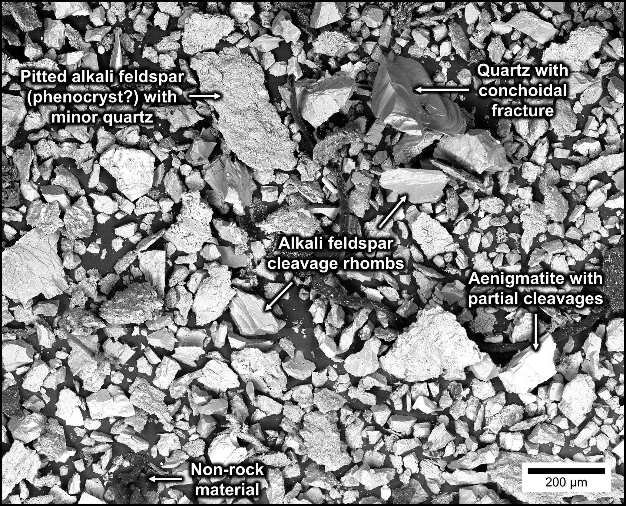 Figure 4Representative backscattered electron (SEM-BSE) image of the rock powder from the striking bands of Ailsa Craig Common Green curling stones from Curl Edinburgh (Edinburgh, UK).