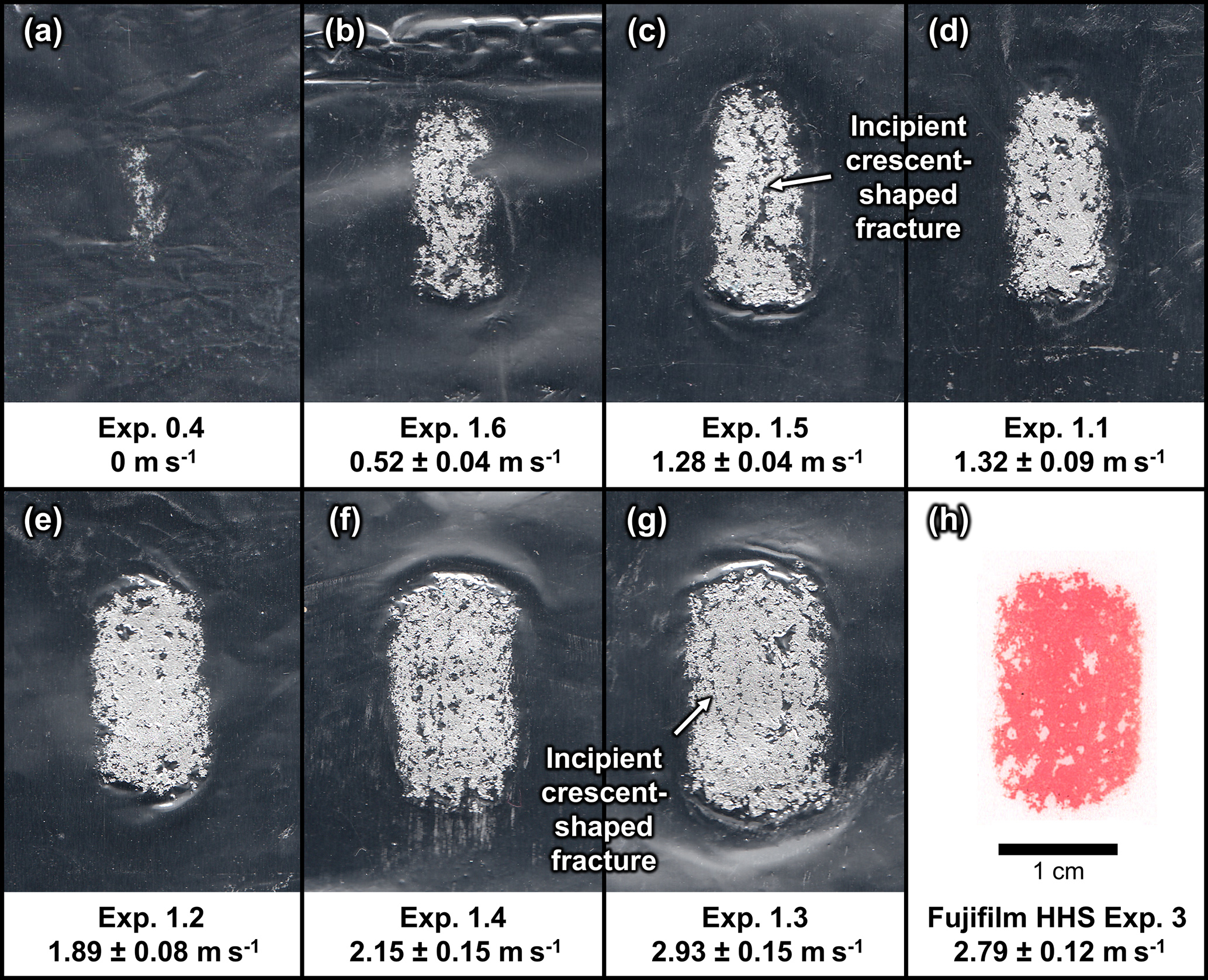 Figure 5Contact areas recorded from various on-ice experiments using Ailsa Craig Common Green striking bands at Curl Edinburgh (Edinburgh, UK). (a–g) Contact areas recorded on aluminium foil at increasing normal velocities: (a) 0 m s−1, (b) , (c) , (d) , (e) , (f) , (g) . (h) Contact recorded on Fujifilm HHS pressure-sensitive film (at ) shows fully saturated contacts, indicating stresses in excess of 300 MPa.