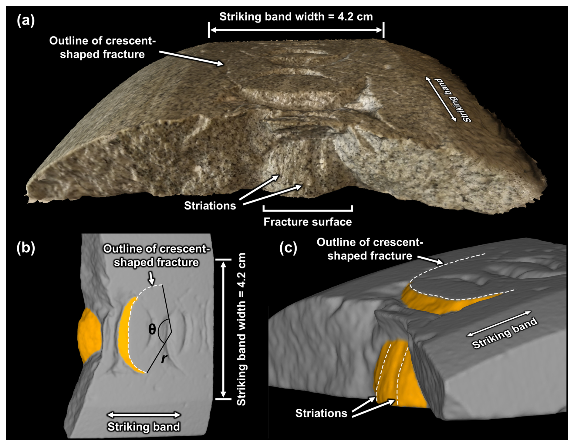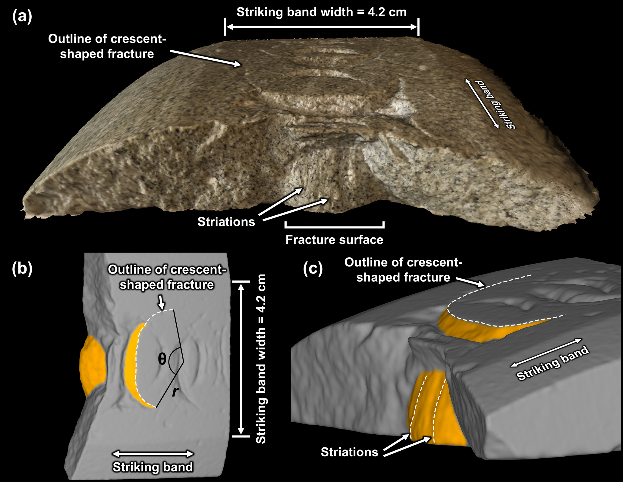Figure 6(a) Photogrammetric and (b–c) structured-light 3D scans of an Ailsa Craig Blue Hone striking band (AC-01), in which the 3D morphology of an isolated, mature-stage crescent-shaped fracture is exposed (note that the majority of fractures in this sample are juvenile). (a) Oblique radial view of striking band (with color and topography); the surface of the crescent-shaped fracture has a pearly lustre and is striated. (b) Tangential view of striking band (topography only), showing the orientation of the crescent-shaped fracture (orange) with respect to the striking band; the statistical analyses for radius of curvature (r) and angular length (θ) are illustrated. (c) Oblique profile view (topography only) showing that the crescent-shaped fracture resembles a parabaloid, i.e., it is convex in three dimensions. The striations on the surface of the fracture emanate from the striking band.