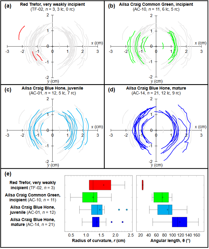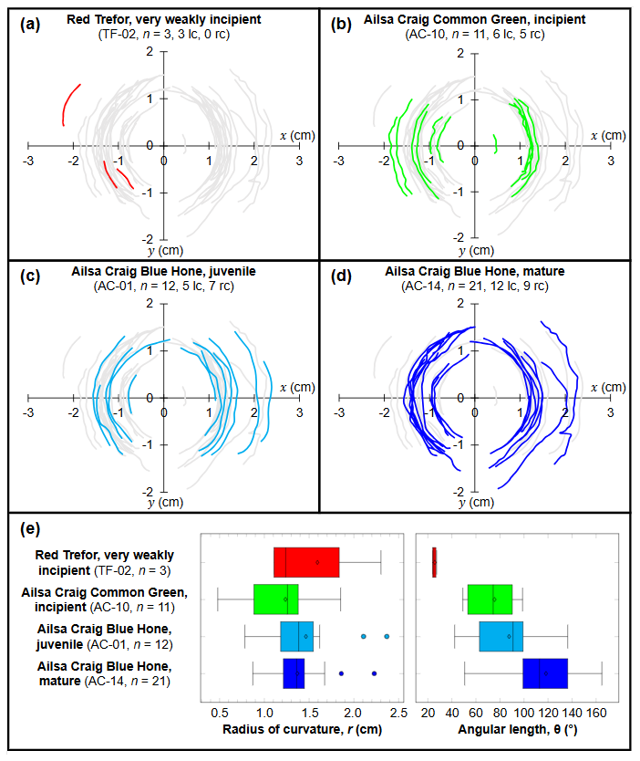 Figure 8Digitised crescent-shaped fractures of selected sections of striking bands, normalized to the centre of curvature, and presented in order of increasing damage state: (a) Red Trefor sample TF-02, (b) Ailsa Craig Common Green sample AC-10, (c) Ailsa Craig Blue Hone sample AC-01, and (d) Ailsa Craig Blue Hone sample AC-14. In each subfigure, the whole data set is shown in grey to contextualize relative distributions in morphology. Abbreviations: lc = left-convex, rc = right-convex crescent-shaped fractures, n = number of observed fractures in striking band segment. (e) Statistics of the digitised crescent-shaped fractures, with the radius of curvature (r, left graph) showing less variation with damage state, and the angular length of the fractures (θ, right graph) increasing with damage state (see Fig. 6 for an illustration of r and θ). Filled circles represent outliers.
