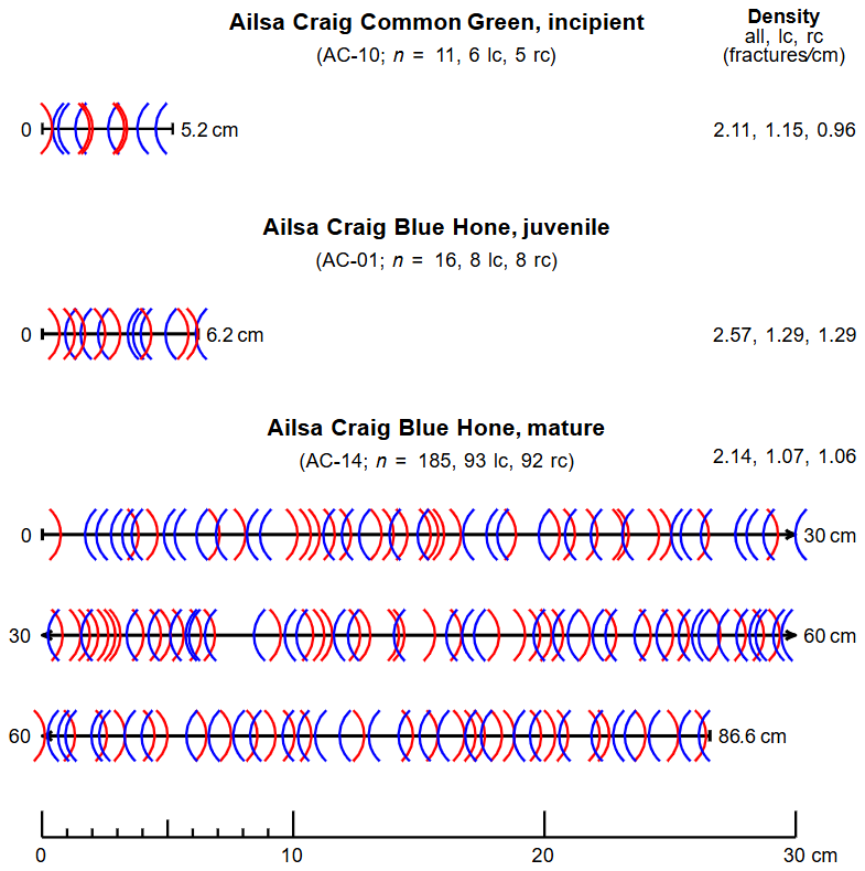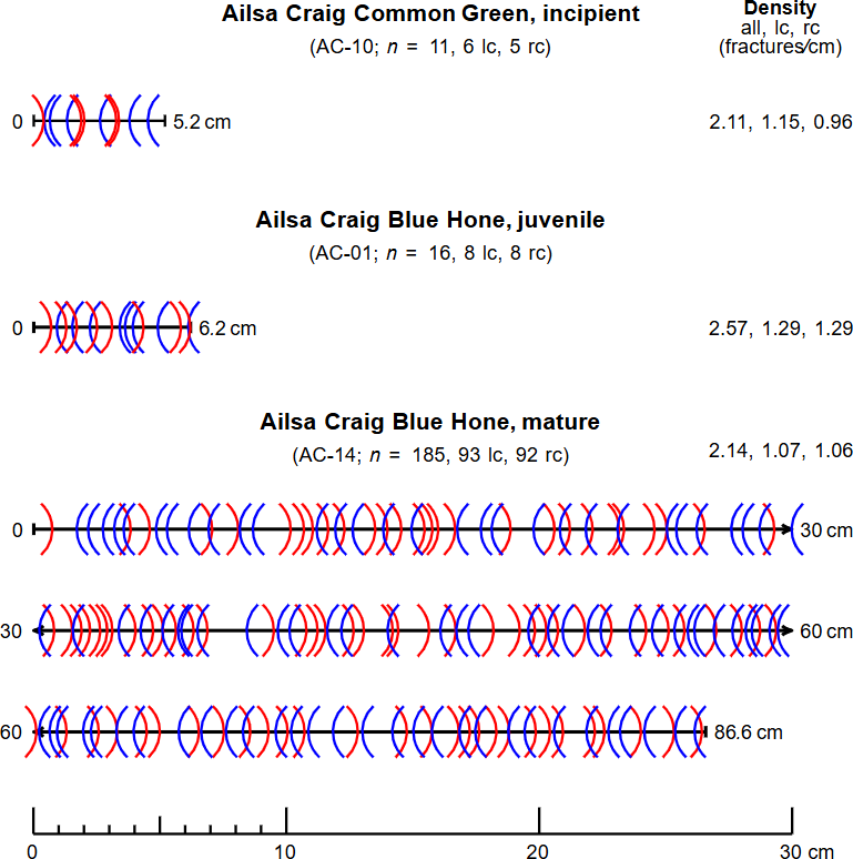 Figure 9Distribution of macroscopic crescent-shaped fractures from various aged striking band samples. Left-convex fractures are marked with blue opening parentheses, whereas right-convex fractures are marked with red closing parentheses. Sample TF-02 (Red Trefor, very weakly incipient) is not shown due to the lack of intersection data. Symbols and abbreviations: lc = left-convex, rc = right-convex, n = total number of observed fractures.
