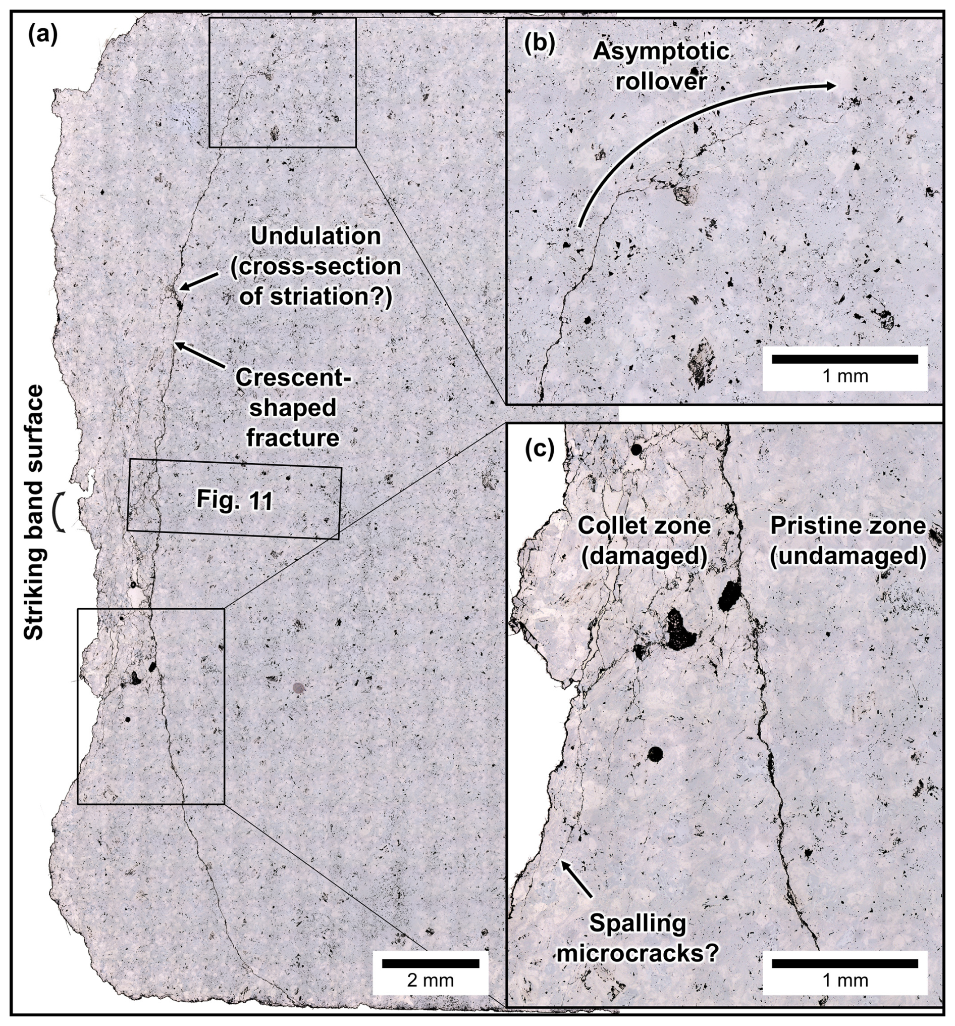 Figure 12Evolution of crescent-shaped fractures and microscale damage in Ailsa Craig Blue Hone curling stones (radial section). (a) Pristine samples contain randomly oriented, pre-existing microcracks. (b) Microcracks form parallel to the striking band and coalesce into an incipient crescent-shaped fracture. (c) The main crescent-shaped fracture widens and evolves into a microfault with visible gouge; a damage zone consisting of interconnected microcracks and microfaults develops in the collet zone between the striking band (direction indicated by arrow) and the main crescent-shaped fracture.