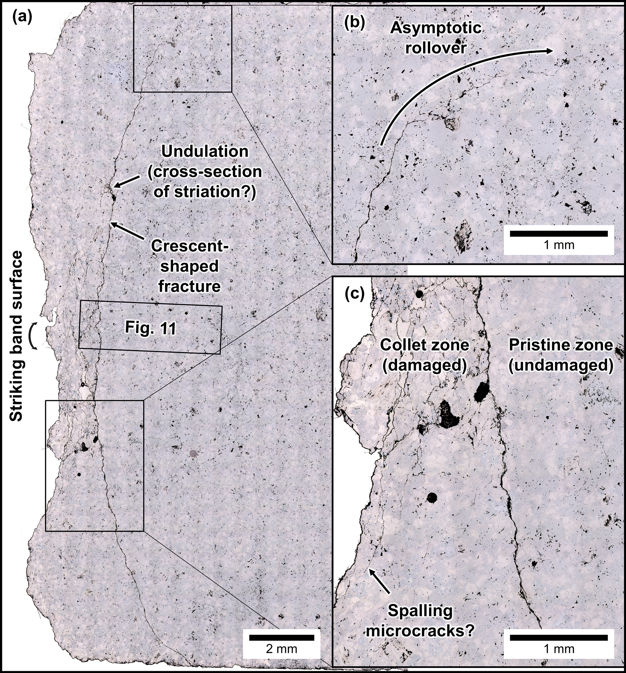 Figure 10(a) Radial section of Ailsa Craig Blue Hone striking band showing juvenile fractures under reflected light (sample AC-03-1). (b) Near the margins of the crescent-shaped fracture, the curvature of the crescent-shaped fracture rolls over to become horizontally asymptotic. (c) Damage is strongly restricted to the collet zone (the collet zone is a wedge-shaped area located between the crescent-shaped fracture and the striking band). Some microcracks are visible near the surface of the striking band and may correspond to spalling.