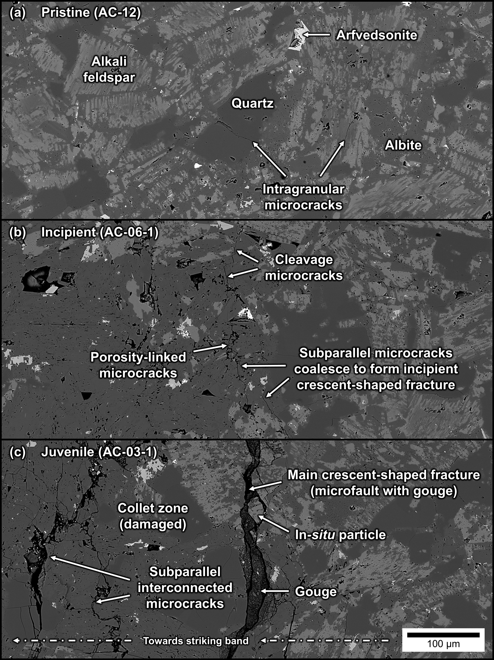 In a more damaged juvenile sample (Fig. 12c), the main crescent-shaped fracture is expressed as a microfault with larger apertures between 3–45 µm. Importantly, this fracture contains what appear to be domains of fault gouge. This microfault is broadly coincident with quartz–alkali feldspar phase boundaries and grain boundaries between alkali feldspar grains, and can be transgranular through alkali feldspar and quartz grains. However, the coarseness of the microfault generally obscures these microstructural relationships. The gouge within the main crescent-shaped fracture consists of (1) larger (up to 30 µm), locally derived, in-situ fragments, along with (2) smaller particles which have likely been rotated and displaced (Fig. 12c). The larger grains are almost entirely composed of alkali feldspar, whereas smaller grains are a combination of alkali feldspar, quartz, and albite, with rare arfvedsonite and high-field-strength-element minerals (note that among the smaller grains, quartz and albite cannot be distinguished on the basis of their similar SEM-BSE responses). Where the crescent-shaped fracture crosscuts arfvedsonite, the mineral can be found fragmented in the gouge zone, suggesting that the particles are locally derived. The collet zone exhibits a network of apparently subparallel, interconnected intra- and intergranular microcracks (Fig. 12c). These microcracks are heterogeneous and can be further subdivided into several types: (1) flaw-induced, porosity-linked intragranular microcracks in albite; (2) intragranular cleavage microcracks in alkali feldspar and arfvedsonite; (3) flaw-induced, grain-boundary microcracks between alkali feldspar and quartz grains, or among feldspar grains; and (4) conchoidal, intragranular impingement microcracks in quartz grains. Fracture networks are extensively developed in albite, possibly owing to the high degree of porosity within these grains.