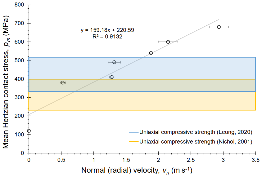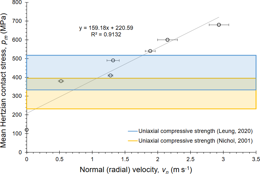Using Eq. (5) of the contact mechanics approach, we can calculate the impact stresses. For the maximum impact velocity of , we determined an average stress over the contact area σavg of 680 MPa (with a minimum error on the order of ∼30 MPa based on the estimate of Poisson's ratio; Leung, 2020). Alternatively, using the impact mechanics approach (Eqs. 1 and 2), we arrive at an average stress over the duration of the collision of 550±80 MPa, which agrees with the former approach (see File S5 in Leung et al., 2025, for calculations). For the same impact velocity we also calculated the minimum elastic strain and strain rate using Eqs. (3) and (4), assuming for the sake of simplicity that all strain is accommodated elastically, and a Young's modulus value of 39 GPa for Ailsa Craig Common Green (Leung, 2020). This calculation yields a time-averaged elastic strain of 1.4±0.2 % and a time-averaged elastic strain rate of .