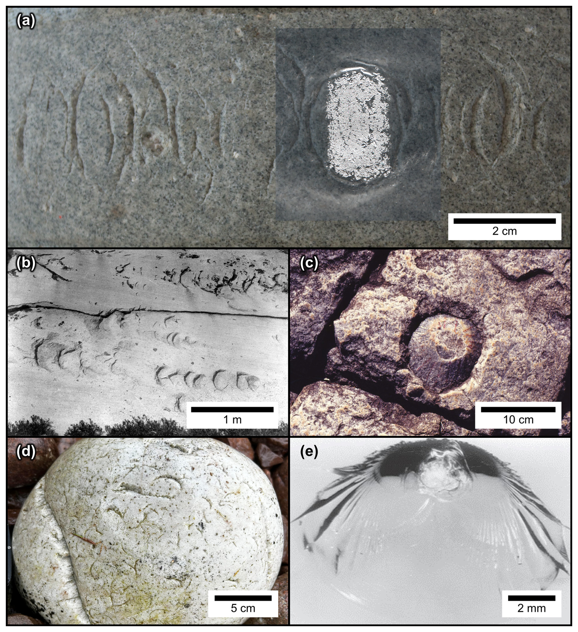 Figure 14(a) Superimposing the contact area from the on-ice experiments (Exp. 1.3) onto an aged striking band (AC-01) shows the resemblance in shape and size between the contact areas and crescent-shaped fractures, suggesting that crescent-shaped fractures are Hertzian cone fractures. (b–e) Examples of natural and antropogenic Hertzian cone fractures. (b) Glacial crescentic gouges (a subclass of chatter marks) produced by point loading of erratics via glacial transport, Sierra Nevada, CA, USA (from Gilbert, 1906). (c) Percussive fractures produced by point loading of boulders in a fluvial environment (paleowaterfall), eastern circumference of Bushveld Complex, South Africa (from Baratoux and Reimold, 2016. © 1999–2026 John Wiley & Sons, Inc. All rights reserved. See also Reimold and Minnitt, 1996). (d) Cobblestone showing abundant crescent percussion marks formed during weathering and transport, Culkein, NW Scotland, United Kingdom. (e) Experimentally generated Hertzian cone fractures in glass; note the presence of mirror-mist-hackle structures on the surface of the cone fracture (from Wang et al., 2017, © 2026 Elsevier B.V. All rights reserved).