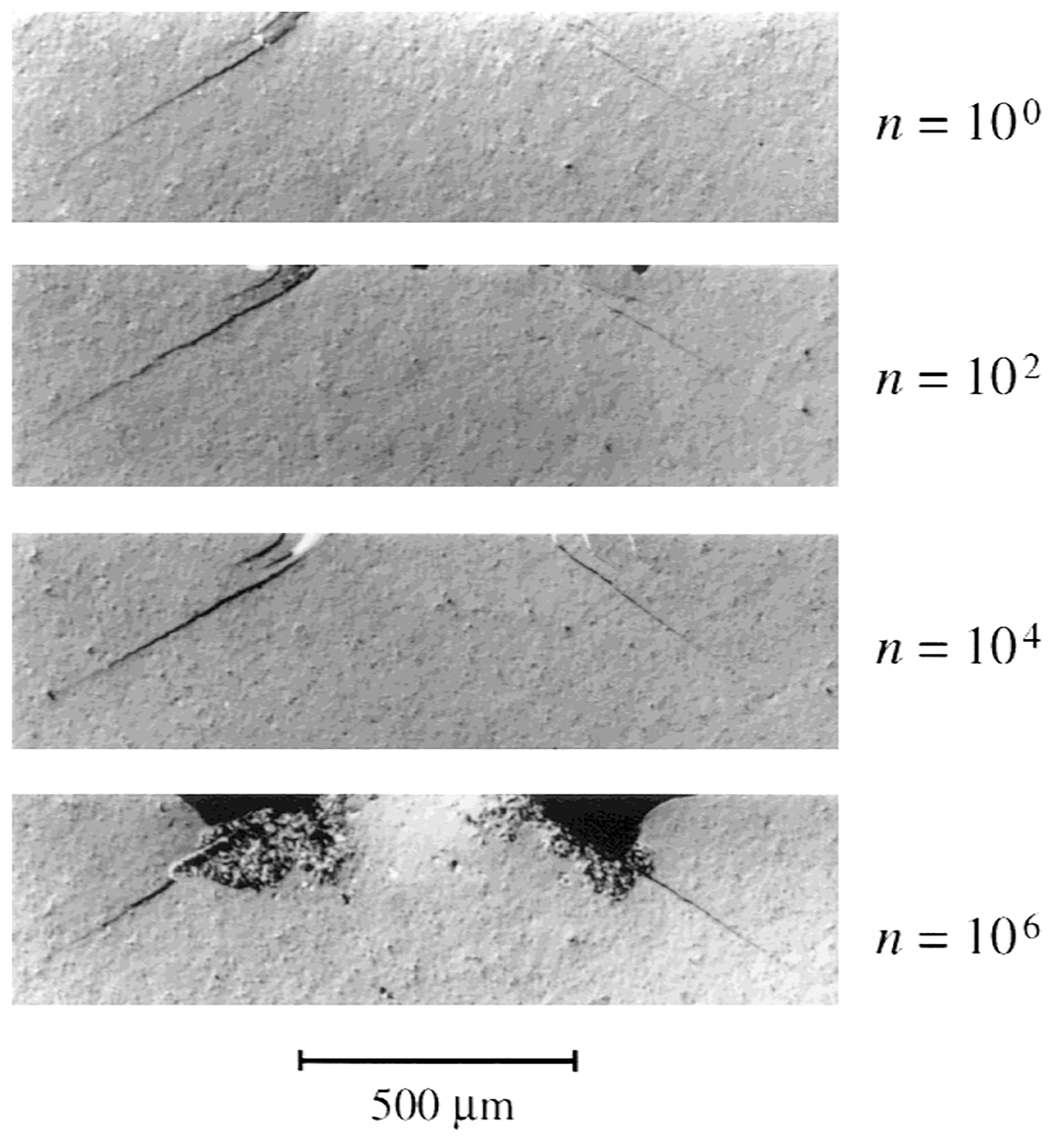 Figure 15Damage evolution of silicon carbide ceramics with homogeneous grain sizes under cyclical spherical indentation (radius = 3.18 mm, force = 1000 N, frequency = 10 Hz) under Nomarski interference, n = number of loading cycles. From Padture and Lawn (1995); Lawn (1998). © 1999–2026 John Wiley & Sons, Inc. All rights reserved.