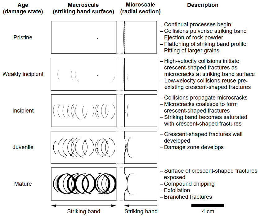 The total density of crescent-shaped fractures does not increase significantly after the damage state exceeds an incipient state (Fig. 9), although it should be noted that pristine to weakly incipient stones (such as TF-02) have distinctly lower fracture densities. This suggests that the density of crescent-shaped fractures must increase between the weakly incipient and incipient damage states, at which point the striking band becomes saturated in crescent-shaped fractures.