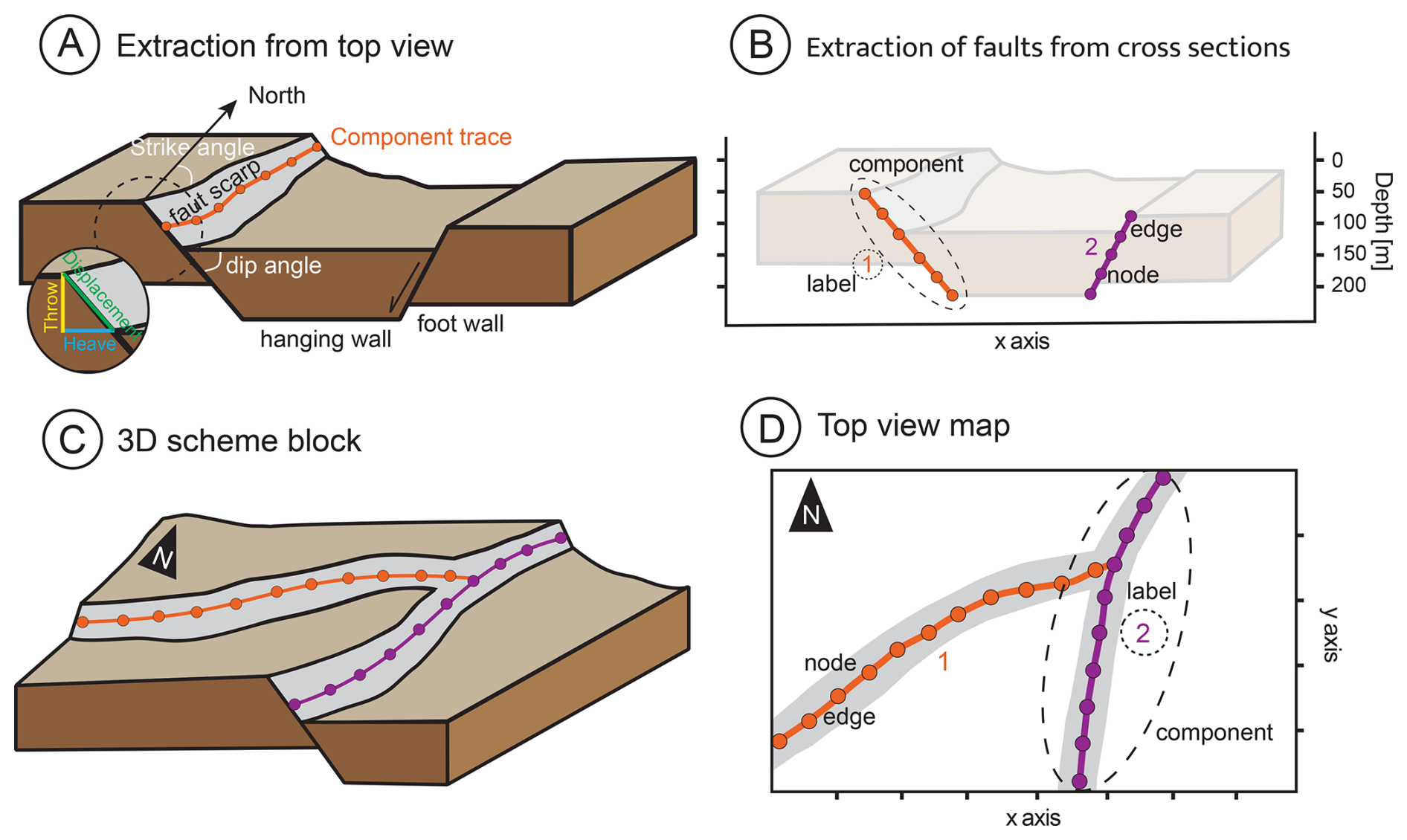 Figure 1Network description exemplified using normal faults. The fault systems are described as networks, consisting of sets of nodes (depicted as circles in the figure) and edges (the segments connecting the nodes). The nodes are defined by their spatial (x, y) coordinates in 2D space, and the edges are defined as a pair of connected nodes. Components are groups of linked nodes; they represent individual faults. Per default, components are labelled via consecutive, integer fault identifiers. (A) Map view showing the location of the mapped faults on the scarp. Each fault is characterized by key geometric parameters: throw (vertical offset), heave (horizontal offset), and displacement (net slip). (B) Fault traces on a vertical cross section. (C) Triple junctions (or y-nodes) are split based on their orientation, ensuring that the two closest branches remain connected while the splay is cut off. (D) Top view of triple junctions illustrating the geometric configuration.