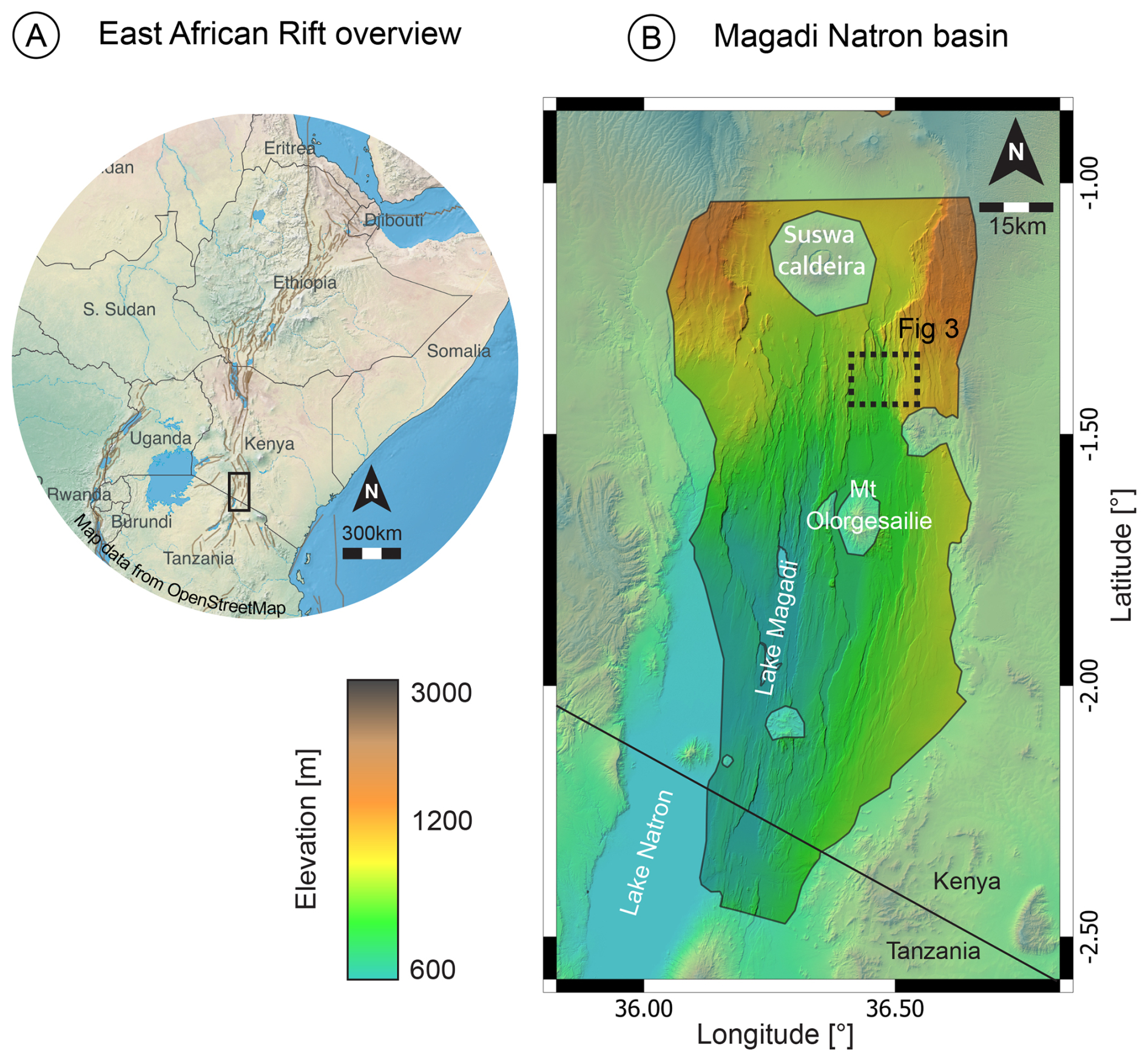 Figure 2Context map of the DEM application. The Magadi-Natron basin is located south of the magma-rich eastern branch of the East African Rift System. (A) the major active faults are drawn in brown, from Styron and Pagani, 2020, on OpenStreetMap contributors 2025. Distributed under the Open Data Commons Open Database License (ODbL) v1.0. (B) the colours represent the topography using GLO-30 DEM. The blue shaded background represents the clipping mask used to focus on the intra-rift faults. The black dashed frame is the small area used in Fig. 3 and in the DEM tutorial.