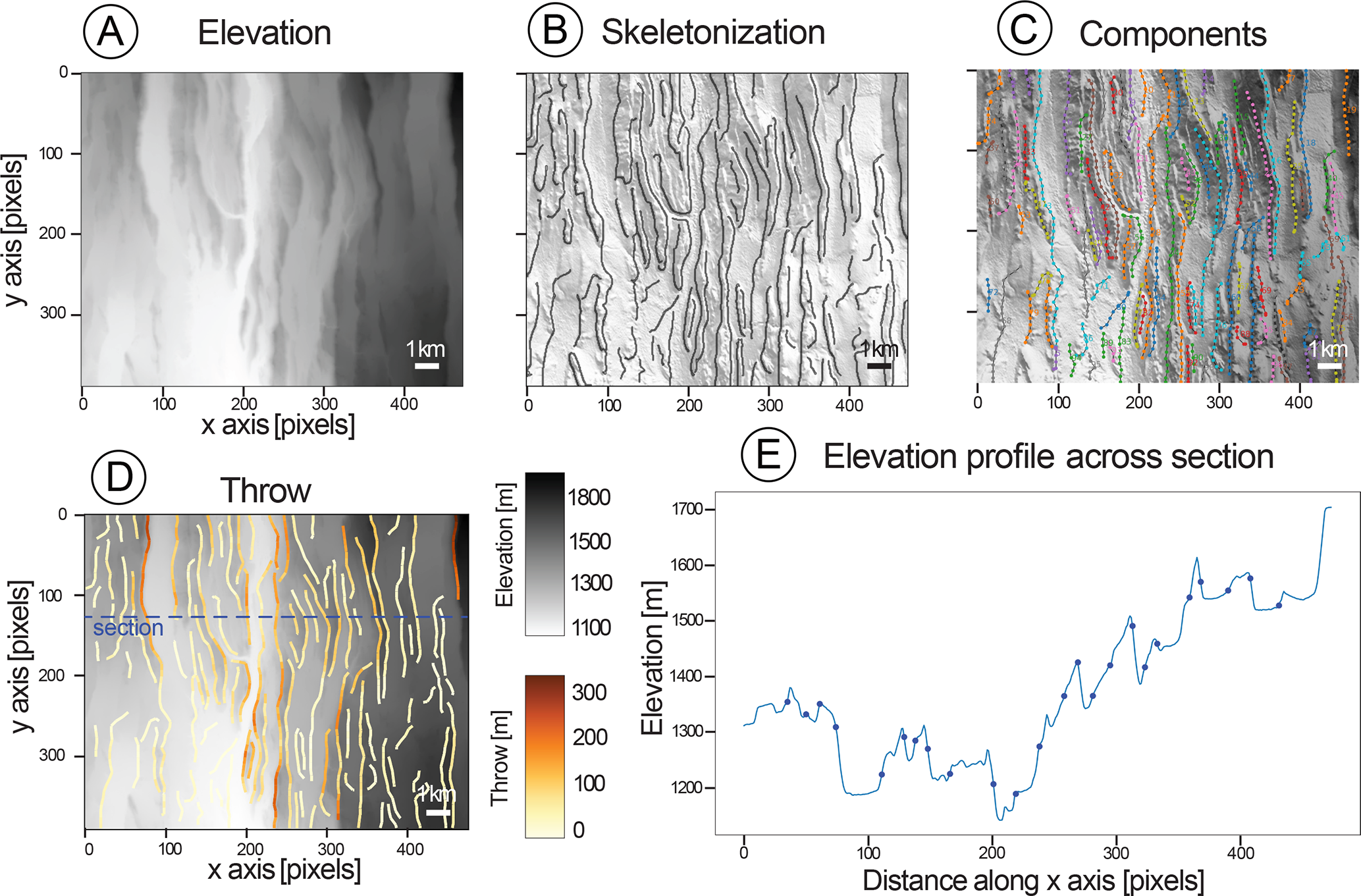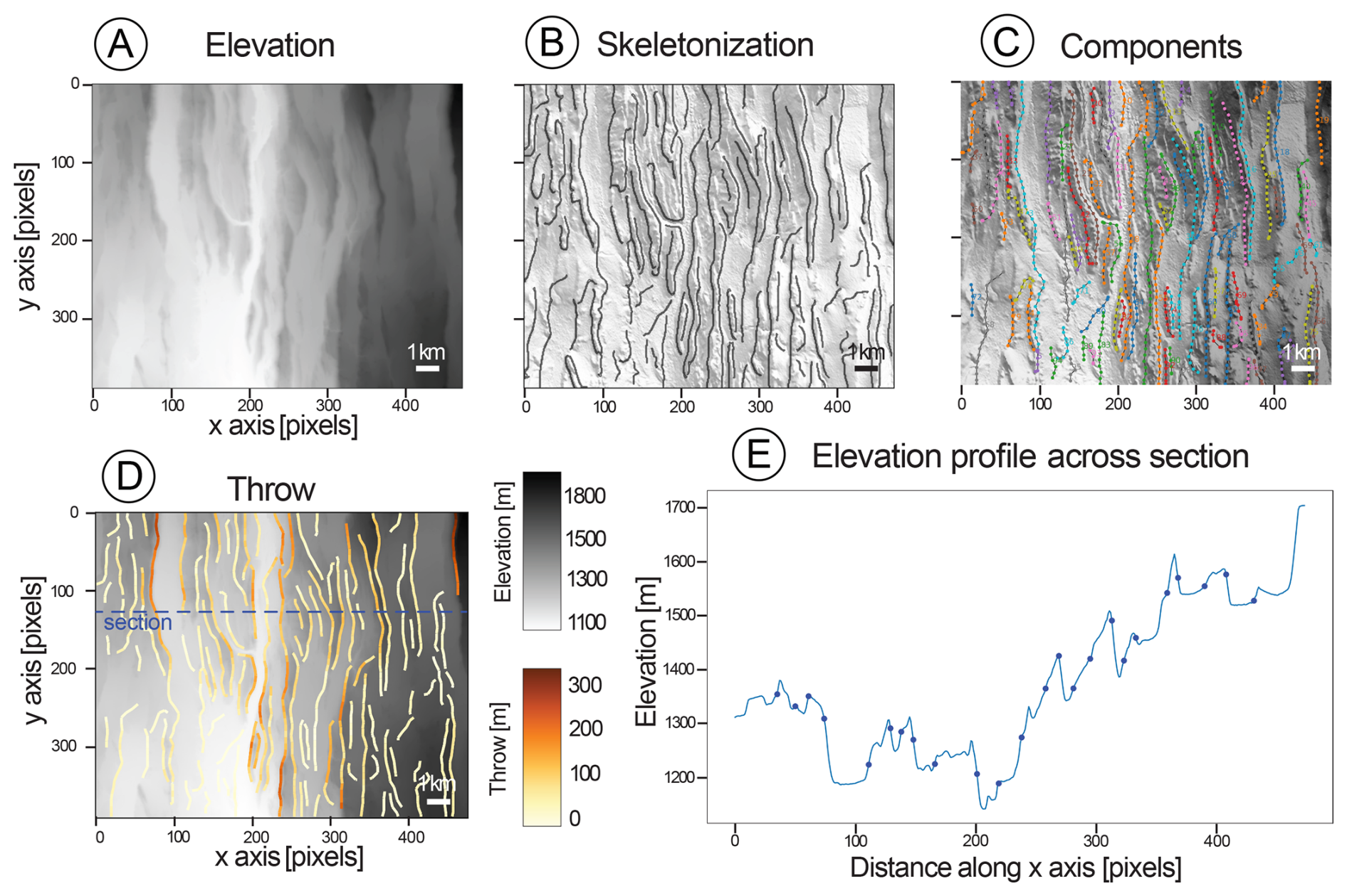 Figure 3Workflow of the DEM processing. (A) Raw digital elevation model, (B) Skeleton, detected structures are 1 pixel wide, plotted over a hillshade of the DEM. (C) Fault network over DEM and hillshade of DEM. Different colours represent different components. (D) Throw over DEM. (E) E–W cross section perpendicular to the main fault axis at latitude 1.37° S, location shown in panel (D). The dots represent the position of the mapped faults.