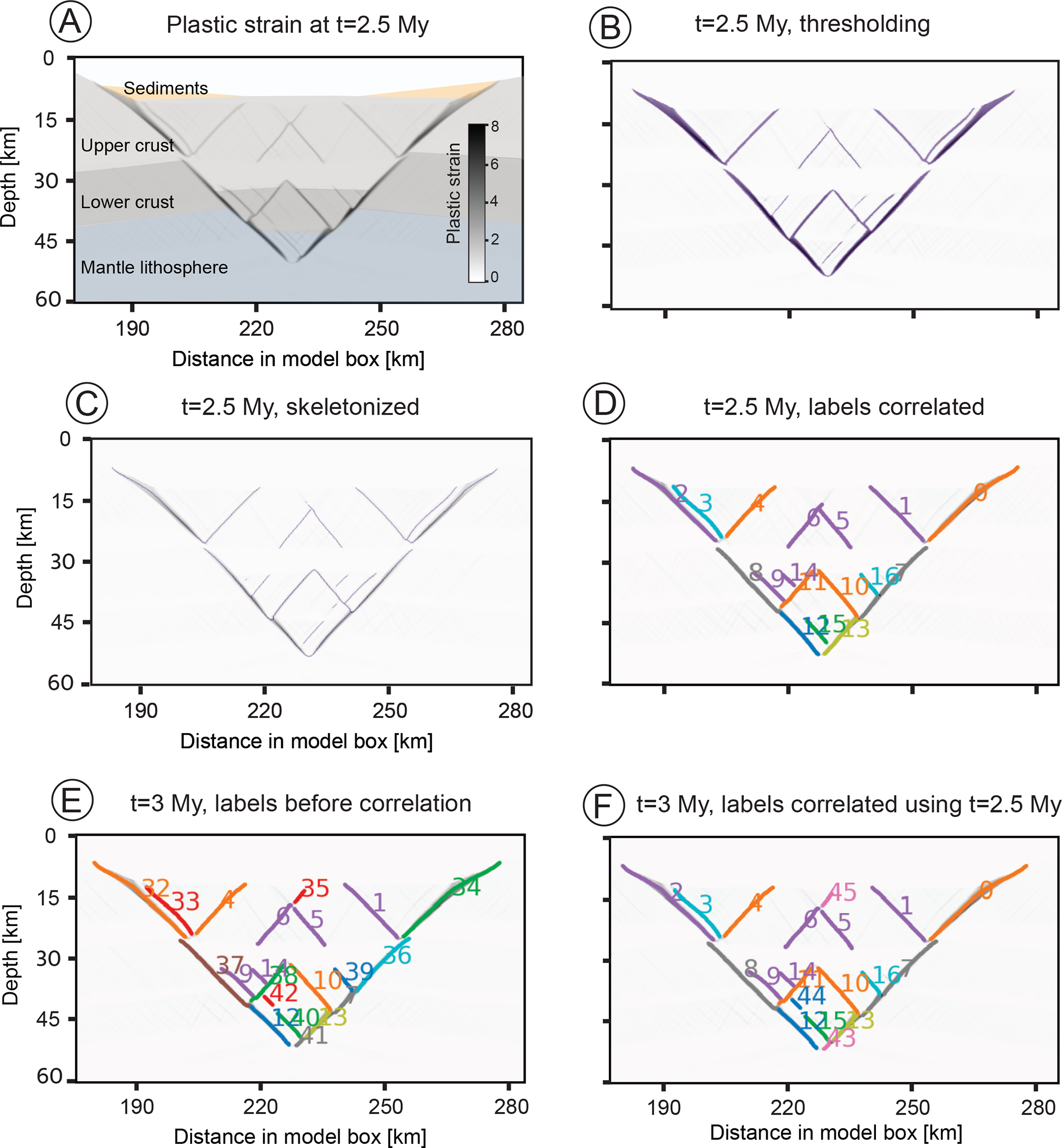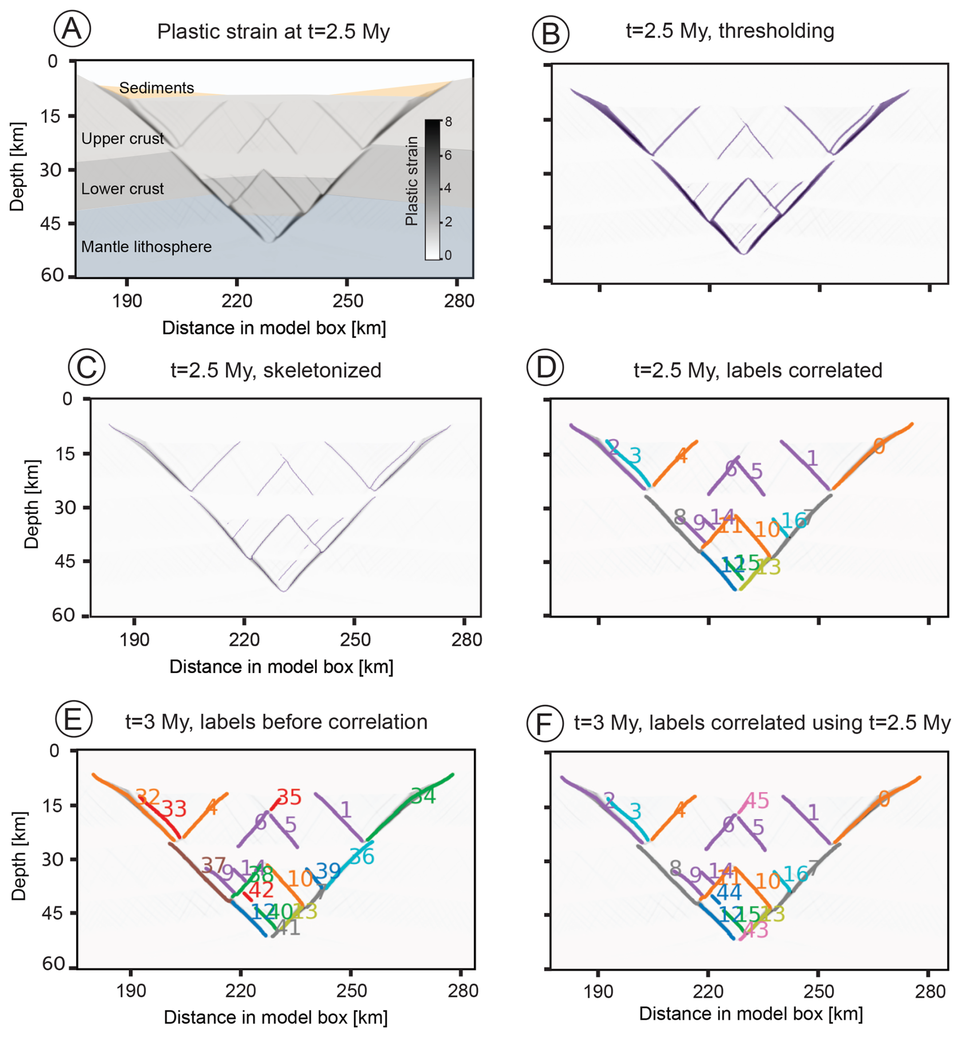 Figure 4Fault correlation in a numerical rift model. (A) Material layers and plastic strain at t=2.5 Myr. The network consists of large border faults and smaller intra-rift faults. (B) Plastic strain at t=2.5 Myr, where pixels exceeding threshold strain are shaded in purple. (C) Skeletonization generates lines tracing the faults, here shown in purple underlain by plastic strain in grey scale. (D) Fault network extracted at t=2.5 Myr correlated using earlier and later time steps (forward + backward correlation). (E) Fault network extracted at t=3 Myr (before correlation). (F) Fault network at t=3 Myr, correlated using labels at 2.5 Myr. In practice, the period between subsequent correlation times is much smaller. This interval was chosen here to exhibit enough difference to show the effect of the correlation. The labels of the faults are shown as numbers next to the corresponding faults using the same colour.