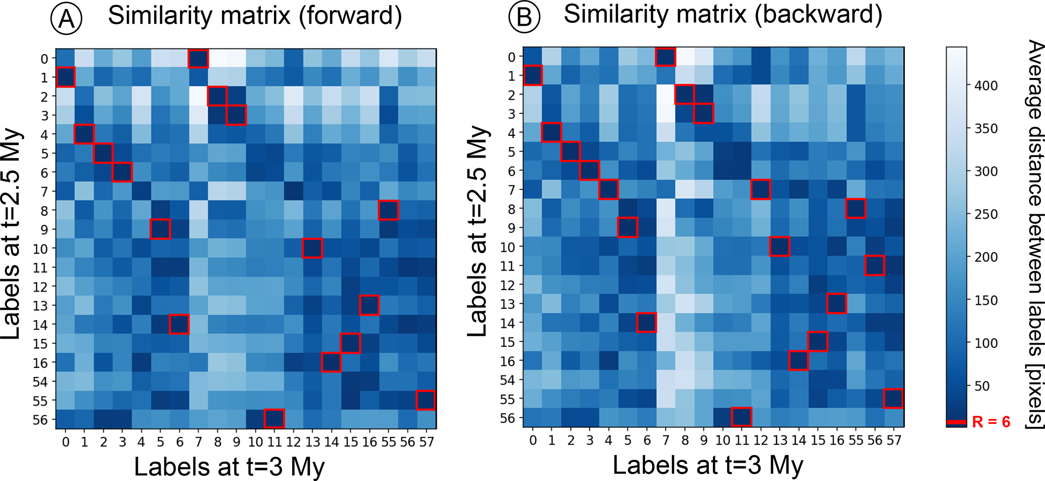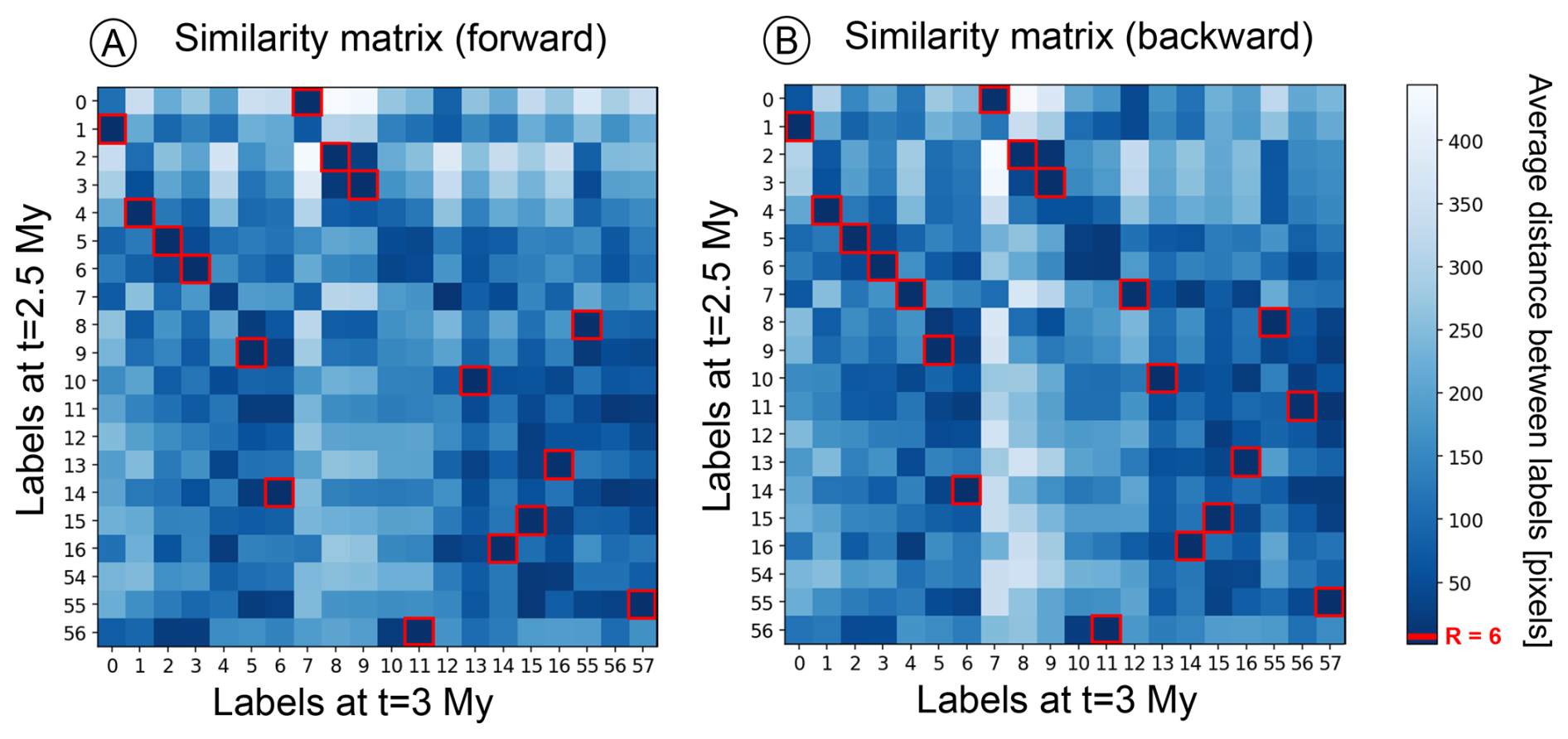 Figure 5Correlation of faults across two time-steps. The similarity matrix shows all the labels of a pair of compared graphs. In (A), the forward direction means the graph at t=2.5 Myr is used as a base to compare with the graph at t=3 Myr. In backward direction (B), the base for the correlation is the graph at t=3 Myr. Faults with a low average distance exhibit a high similarity. The red squares indicate instances where the distance between two faults falls below a user-defined threshold radius R, representing the same fault at different times. Note that axes depict original labels that have not been correlated according to the full fault record.