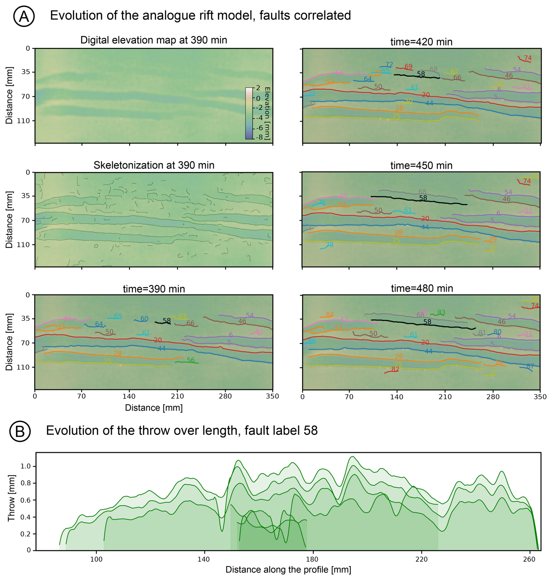 The structural analysis is conducted as outlined in Sect. 3.1.3 for each time step. Here, the measured dip can be directly used to compute the displacement (net slip) and extension (heave) of the faults as erosion is absent. The correlation and proper labelling of faults between consecutive time steps enable the visualization of the evolution of specific geometric parameters over time. For example, the throw as a function of fault length (Fig. 7B) is commonly used to infer kinematics of normal fault growth (Lathrop et al., 2022; Schlagenhauf et al., 2008) and to assess the growth stage of the fault network.