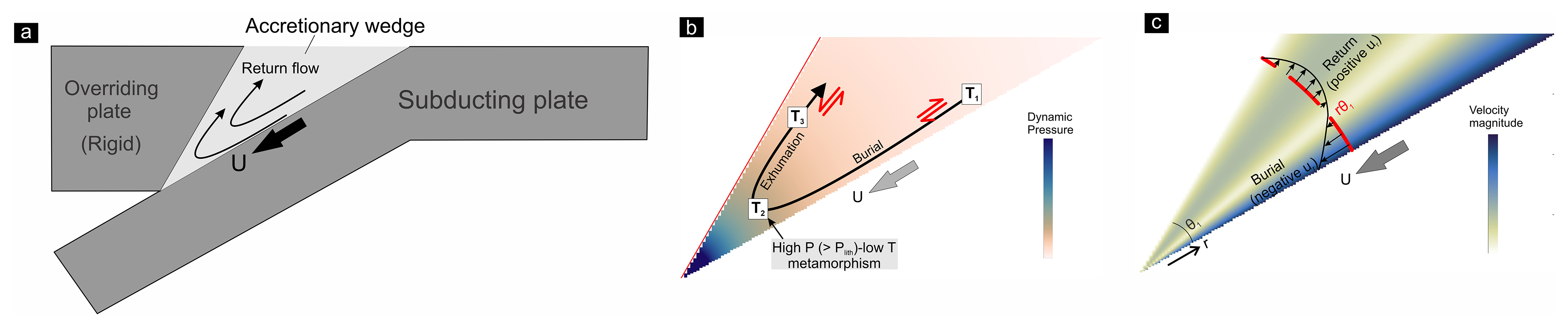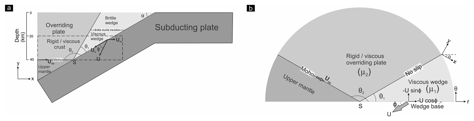 The present theoretical model is developed in the premises of downward-tapering accretionary wedges, which has been extensively used in earlier theoretical models (Cloos1982), analogue experiments (Luján et al.2010) and numerical simulations (Pusok et al.2022; Yamato et al.2007). To simplify the theoretical treatment, the wedge is assumed to terminate at a fixed-point S, located at a depth of about 40 km (S-point boundary condition of Willett et al.1993) (Fig. 2a). This is a limitation in our model setup, as the wedges in subduction zones can describe a narrow opening at their base, allowing a small fraction of sediments to be transported to mantle depths (Agard et al.2009; Guillot et al.2009). Traditionally, researchers have modelled accretionary wedges using Coulomb materials, primarily to analyze their mechanical stability as a function of the taper angle (Dahlen et al.1984; Dahlen1990). This modelling approach is, however, applicable for shallow-crustal deformations. Below the brittle-ductile transition, at middle and lower crustal depths, viscous processes dominate in the wedge deformations (Mannu et al.2016; Pavlis and Bruhn1983), and thereby demand a viscous rheological approach. To capture the exclusive effects of viscous wedge kinematics, our theoretical treatment excludes the additional influence of gravity that can arise due to the density contrast between the wedge and the overriding plate. In natural settings, however, buoyancy forces arising from density differences can also act as additional factor in driving the upward velocity of crustal blocks, especially at sub-crustal level (Ernst et al.1997; Maiti et al.2020; Schmalholz and Schenker2016). Also, we consider Newtonian viscous rheology to develop the present theoretical model. This linear rheological approximation is evidently simplification of the natural rheological settings that generally show a power-law creep behavior (Ranalli1995). In addition, their viscosity can vary with depth. However, it has been shown previously that the non-linearity of the rheology plays little role in the first-order kinematics of a corner flow (Ribe2015, 2018).