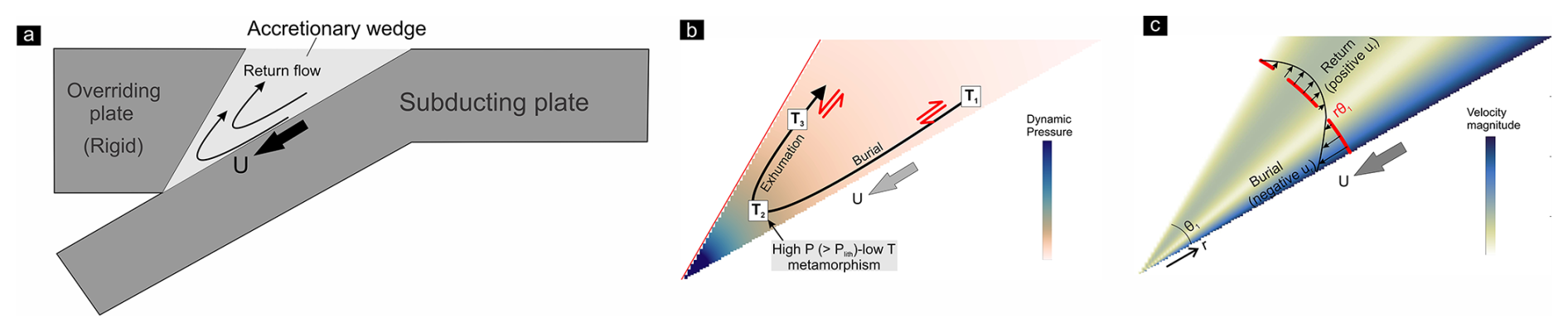 Geochronological records of exhumed blueschists and eclogites suggest that high-pressure rocks can be exhumed at varied rates (<1 mm yr−1 to a few cm yr−1) depending upon the tectonic environments (Agard et al.2009; Ernst1988; Rubatto and Hermann2001). Conceptual, analytical and numerical models consider a wide range of factors, such as erosion and isostatic adjustment (Brandon et al.1998), buoyant flow of low density crustal units (Chemenda et al.1995; Ernst et al.1997), corner flow circulation within accretionary wedges (Burov and Yamato2008; Cloos1982; Moulas et al.2021), extension-driven ductile thinning and normal faulting (Platt1986; Ring and Brandon2008), and several others (see Platt (1993); Warren (2013), for review) to account for such variations in the exhumation rates. Among them, the corner flow (CF) model (Batchelor1967), which was implemented by Cloos (1982), deals with the problem of exotic high-pressure/low-temperature (HP/LT) blocks within a mudstone matrix in the Franciscan Complex of California. According to this tectonic model, the crustal materials in the lower part of the wedge are dragged down with the subducting plate, eventually set to reverse their flow directions due to the dynamic pressure developed at the bottom of the downward-tapering wedge, as illustrated in Fig. 1. This reversal of flow, hereafter called return flow, causes syn-subduction exhumation of deep-crustal rocks back to the surface. The corner flow mechanism successfully explains the coherent occurrence of extensive HP metamorphic belts with progressively increasing P-T conditions (Agard et al.2001). This flow kinematics accounts for sequential records of prograde high P metamorphism of the oceanic metasediments during their burial, followed by their retrograde mineral assemblages in the uplift phase (Jolivet et al.2003). The prograde metamorphism in a lower geothermal gradient condition, as prevalent in most of the subduction zones results in formation of blueschist, or even eclogites in accretionary wedge complexes. Furthermore, entrainment of oceanic sediments or crustal fragments into the deeper subduction channel can often lead to partial melting at mantle depths (Wang et al.2014; Hebert et al.2009). Petrological data syntheses (e.g., Agard et al.2001) point to, at least two different corner-flow circulations in the tectonic evolution of HP and UHP metamorphic complexes: a relatively shallower (up to 40 km) circulation within accretionary complexes that can be correlated with the formation and exhumation of blueschists and most eclogites, and a deeper circulation in subduction channels, which is responsible for the formation and exhumation of UHP eclogites (Agard et al.2009; Burov et al.2001; Wang et al.2019).