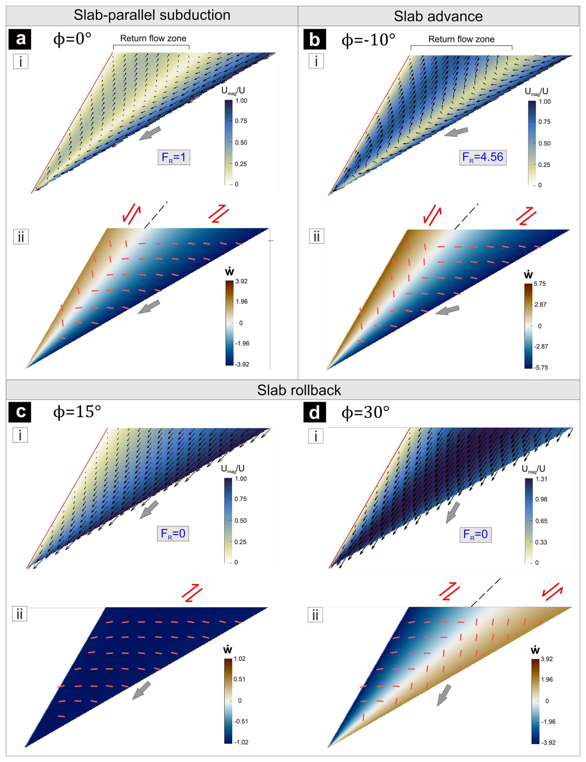 Figure 3Velocity and vorticity fields within wedges with rigid walls in tectonic settings with varying subduction obliquities (ϕ). θ1=30°, and α=30°. Umag: flow velocity magnitude and w˙: a normalized vorticity parameter. Short red lines mark the orientations of the minimum instantaneous stretching axes (ISAmin). Note that addition of a slab advance component substantially multiplies the return flux (FR), whereas slab rollback lowers FR.