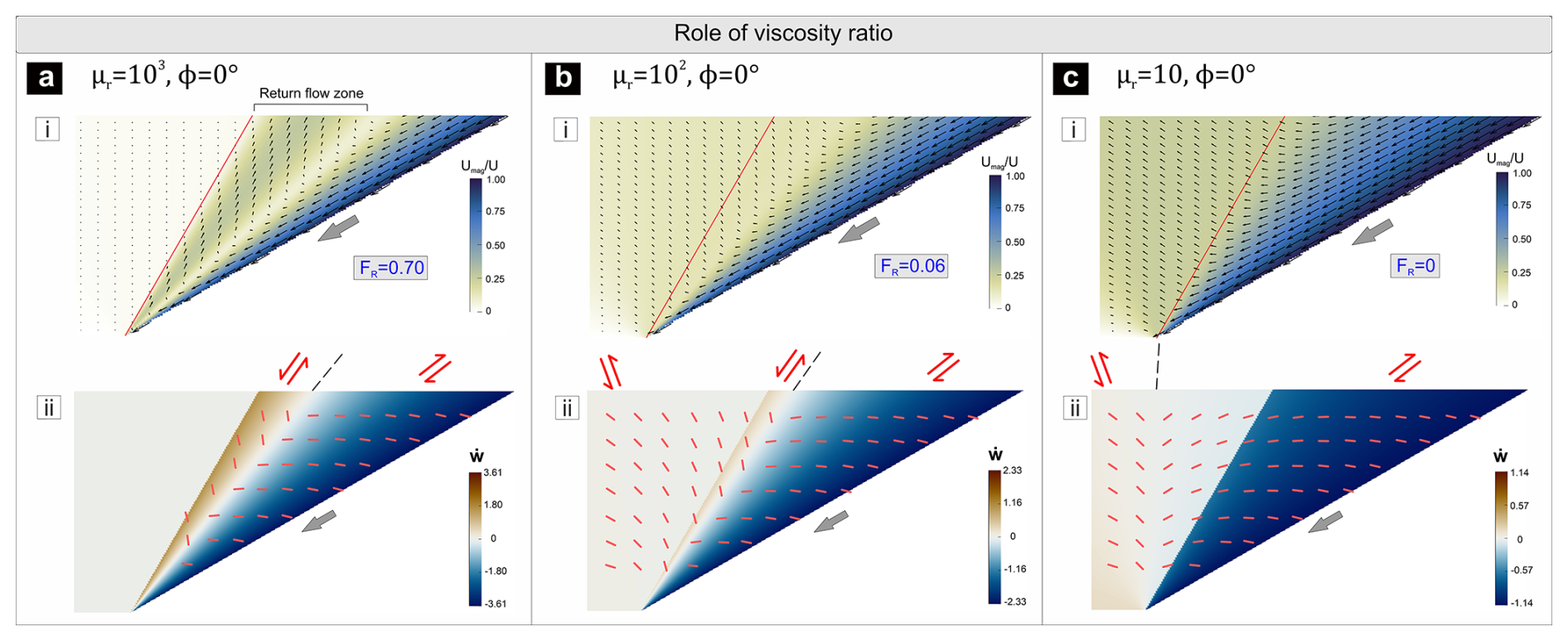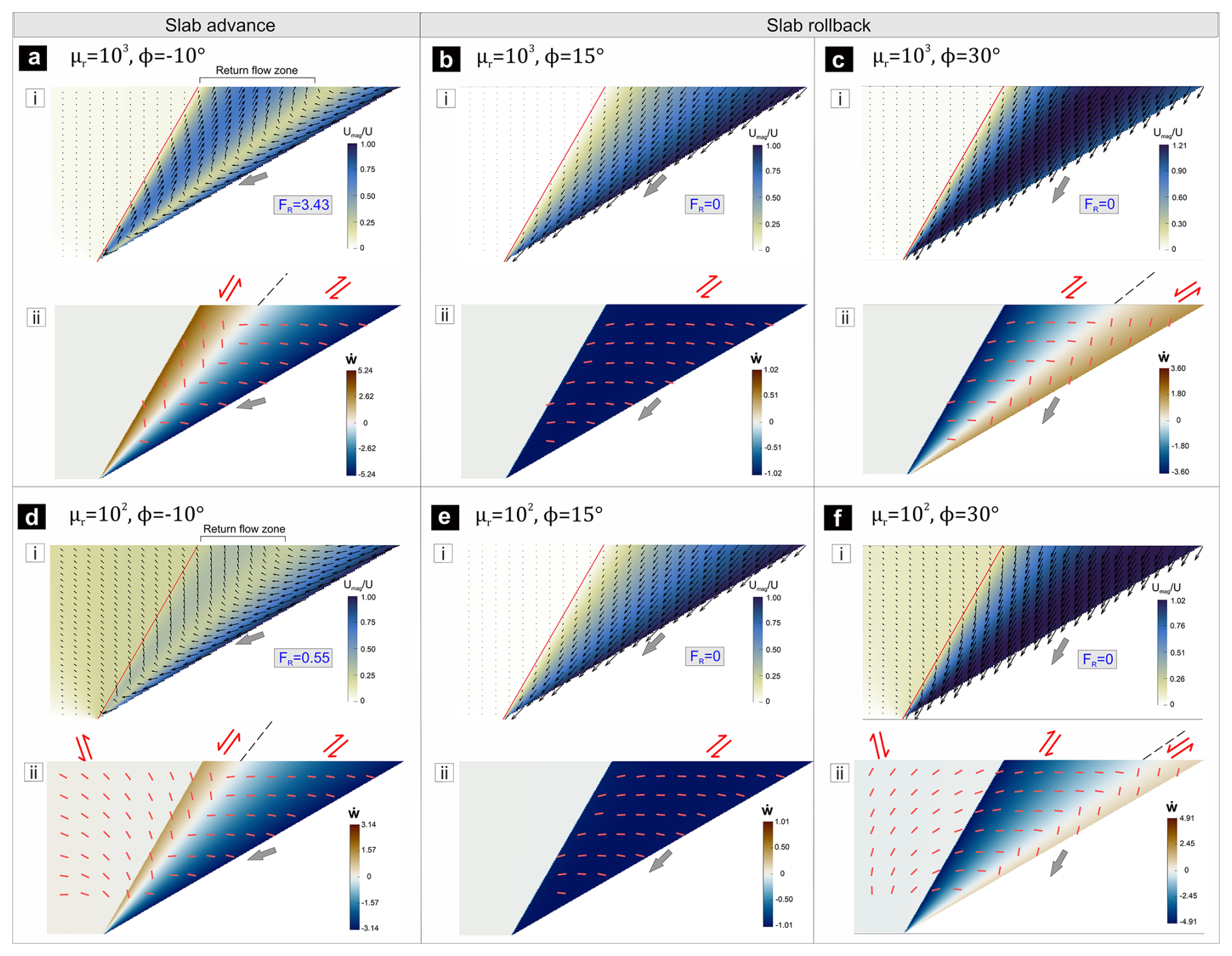 Accretionary wedges can be narrow or wide, depending on the sediment influx and outflux of sediments into or from the wedge (Clift and Vannucchi2004; Cloos and Shreve1988) and the effects of other factors, such as subduction geometry (Pusok et al.2022). Our analytical solutions show that increasing θ1 strengthens the return flux in a wedge (Fig. 6a-i, b-i, c-i). For ϕ=0° and μr=102, an increase in θ1 from 15 to 120° increases FR from 0 to ∼1. Narrow wedges with θ1<15° do not produce any return flows (Fig. 6a-i) when μr is low to moderate (102). In such conditions, the flows fails to redirect wedge materials back to the surface as they are strongly deflected towards the OP, which becomes more pronounced when the plate convergence involves slab advance (see Sect. S1). This kinematics implies that the wedge–OP interface will progressively migrate rearward and result in distortion of the initial wedge geometry. Such an “unstable” state of wedges with low taper angles, and weak walls has been discussed in detail by Moulas et al. (2021).