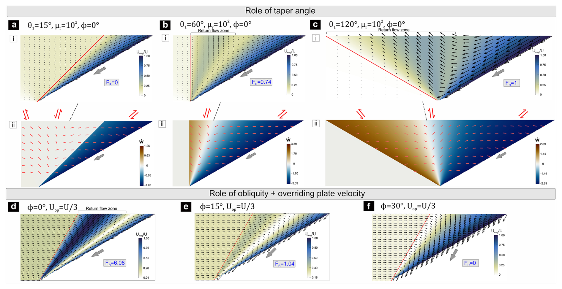 Figure 6(a–c) Influence of taper angle (θ1) on the kinematics of wedges in settings undergoing slab-parallel subduction. (d–f) Effect of trench-ward moving overriding plate movement (Uop=U/3) on the flow patterns of wedges: μr=102, and α=30°.