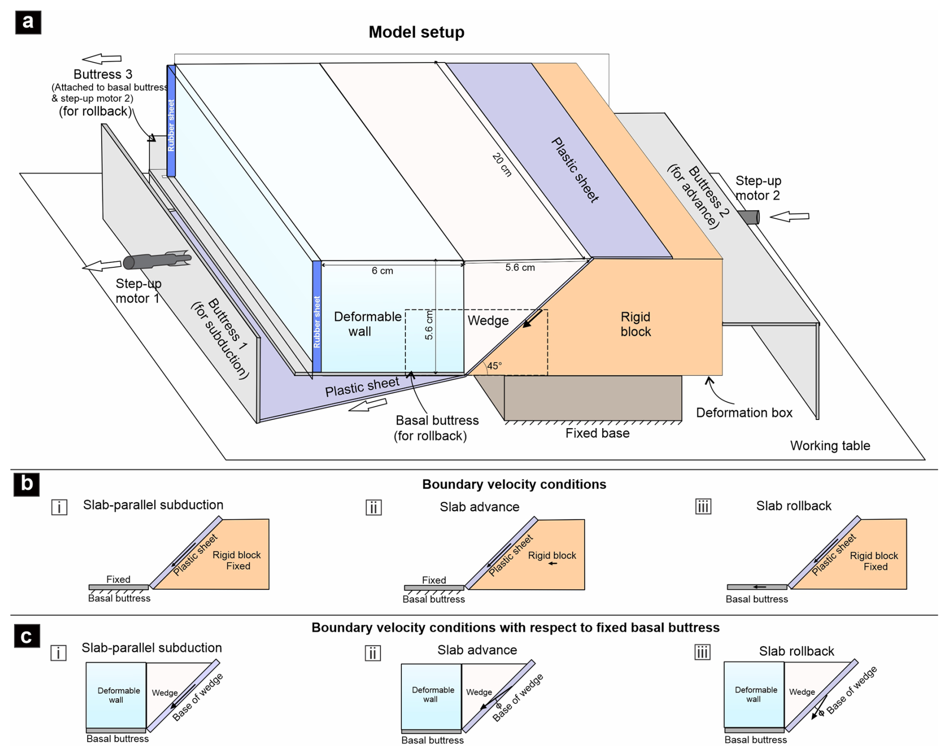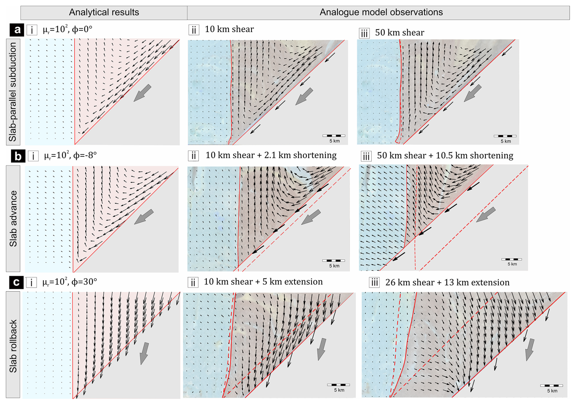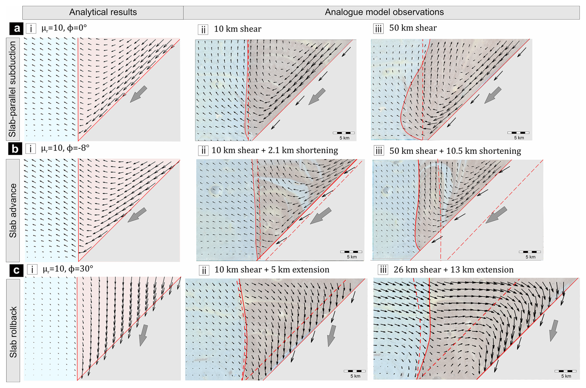Although the classical CF model of Cloos (1982) provides an analytical solution for the velocity field in a corner region, the solution is applicable to a setting with the boundary velocity parallel to the channel's base, and that too for a fixed and rigid hanging wall of the channel. However, the assumption of a rigid hanging wall in the CF modelling may not always be geologically appropriate (Schellart2024), as many convergent zones accommodate significant deformations within the overriding plates. To address this limitation, Moulas et al. (2021), advanced the analytical approach by incorporating a deformable overriding plate. In addition, subduction zones often evolve through slab rollback or slab advance (Bezada et al.2013; Cawood et al.2009; Di Giuseppe et al.2009; Nakakuki and Mura2013), which originate from a complex interplay of various forces, such as, ridge push, slab pull, and mantle convection (Ribe2010; Schellart2008; Xue et al.2022). In such cases, subduction is associated with a non-parallel component of slab velocity. The effect of slab-oblique kinematics on the flow and deformation patterns in the viscous accretionary wedges is yet to be explored, which needs further advancement of the CF modelling.