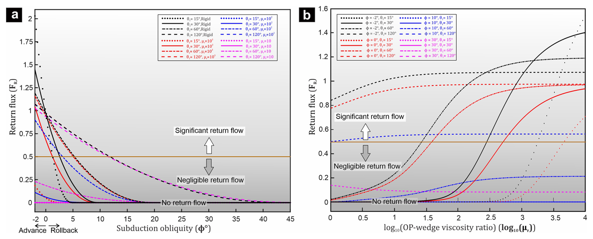 Return flow in a downward-tapering wedge is considered to be one of the most effective exhumation mechanisms to explain the high P- and low T rock assemblages in the accretionary wedges or subduction channels (Agard et al.2009; Cloos and Shreve1988; Yamato et al.2007). For a quantitative analysis of the return flows in a wedge, we introduce a non-dimensional parameter, termed as return flux (FR), which is defined as the ratio of the volumetric rate of materials being returned to that of materials undergoing burial at an instant within the wedge. This parameter accounts for burial and exhumation within a wedge driven by slab-parallel subduction, as well as additional contributions arising from wedge squeezing (or unsqueezing) in cases of non-parallel subduction. In the polar coordinate system under consideration, positive and negative values of the radial component (ur) of the velocity vector indicate the rates of return and burial of wedge materials, respectively (Fig. 1c). For the present simplified 2D problem, we assume the velocity field remaining uniform along the trench, and express FR as: