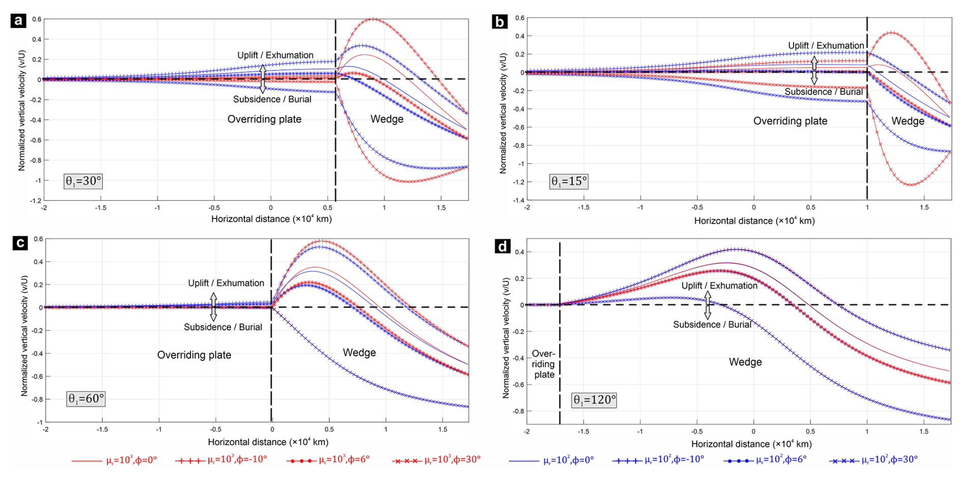 Accretionary wedges that generally accommodate large volumes of sediments fed by subducting oceanic plates play a critical role in modulating the mechanics of active plate interfaces in subduction zones (Agard et al.2018; Angiboust et al.2022; Beaumont et al.1999; Cawood et al.2009; Cloos and Shreve1988). The accreted sediments act as lubricating agents in weakening the plate interface and facilitate subduction (Behr et al.2022; Behr and Becker2018; Hu et al.2021; Pusok et al.2022). Geophysical observations suggest that a fraction of the wedge sediments can also be dragged to deeper mantle regions along the subducting slab in the form of a narrow channel, called subduction channel (Agard et al.2009; Gerya et al.2002; Shreve and Cloos1986; Abers2005). Petrological investigations reveal the omnipresence of high- and ultra-high-pressure (HP-UHP) and low-temperature (LT) metamorphic rocks preferentially in the accretionary belts of both paleo- and modern subduction zones (Agard et al.2001; Glodny et al.2005; Platt1993; Warren2013). The pressure-temperature-time (P-T-t) paths of HP–LT rocks thus provide key fingerprints of the deep-crustal tectonic processes- beginning from burial of sediments and shallow-crustal materials, followed by their HP metamorphism at greater depths and finally their recycling back to the Earth’s surface during active subduction (Van Dinther et al.2012; Yamato et al.2007; Kerswell et al.2023; Vaughan-Hammon et al.2022). During this recycling process, the wedge materials also undergo syn-metamorphic deformations in multiple episodes, giving rise to complex tectonic structures at convergent plate boundaries (Allemand and Lardeaux1997; Ring et al.2020). Understanding the kinematics of accretionary wedges is thus crucially important to interpret the mechanisms of deep-crustal exhumations and associated tectonic processes in subduction zones, which is the central theme of the present theoretical study.