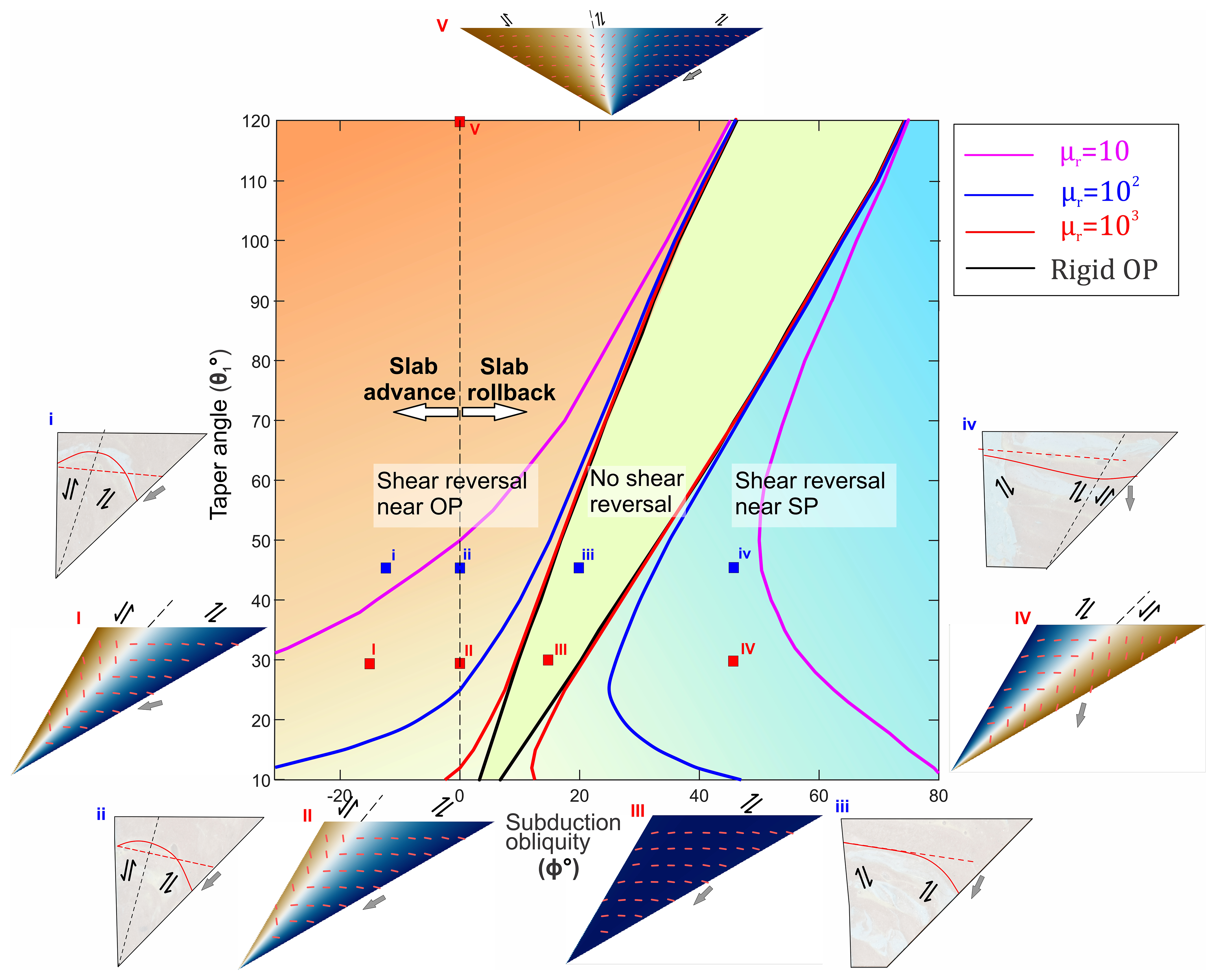 The subduction obliquity also controls the viscous strain distributions in the wedge beneath a rigid OP. When ϕ has negative, zero or extremely low positive values (ϕ<θ1/3), the wedge flows show a vorticity sense reversal, from negative (clockwise, thrust-sense shear) in the basal part to positive (anticlockwise, normal-sense shear) in the roof (Mandal et al.2002). The upper part of the wedge is characterized by vertical to sub-vertical ISAmin axes (Fig. 3a-ii, b-ii). The field of normal-sense shear in the roof region progressively shrinks with increasing ϕ, and vanishes for high slab rollback velocities, corresponding to ϕ>θ1/3. For a relatively large ϕ value (>2θ1/3), the basal part of the wedge produces normal-sense shear with sub-vertical ISAmin axes (Fig. 3d-ii). Conditions in the range θ1/3<ϕ<2θ1/3, in contrast, produces thrust-sense of shear in the entire wedge domain (Fig. 3c-ii).