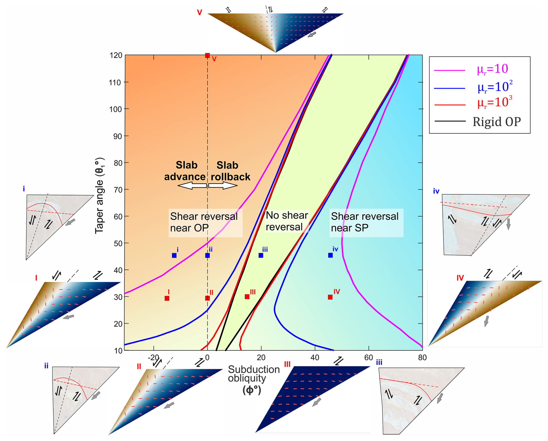 For a constant dip of the wedge–OP interface, decreasing slab dips give rise to increasing taper angles, which in turn facilitate the return flux (FR) within the wedge. A steep dip of the wedge–OP interface yields higher extrusion rates (higher vertical component of velocity in Cartesian xy-frame) of the extruding wedge materials (see also Sanhueza et al.2022). However, steeply dipping slabs generally exhibit high rollback velocities (hence increase in ϕ) due to slab pull force (Stegman et al.2010), which in turn affect the wedge kinematics. From a dynamic point of view, lower subduction dips allow the convergent system to transmit higher stresses to the wedge and the overriding plate, and give rise to intense deformations in the forearc region (Chemenda et al.2000; Guillaume et al.2009).