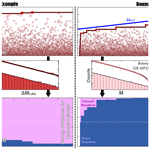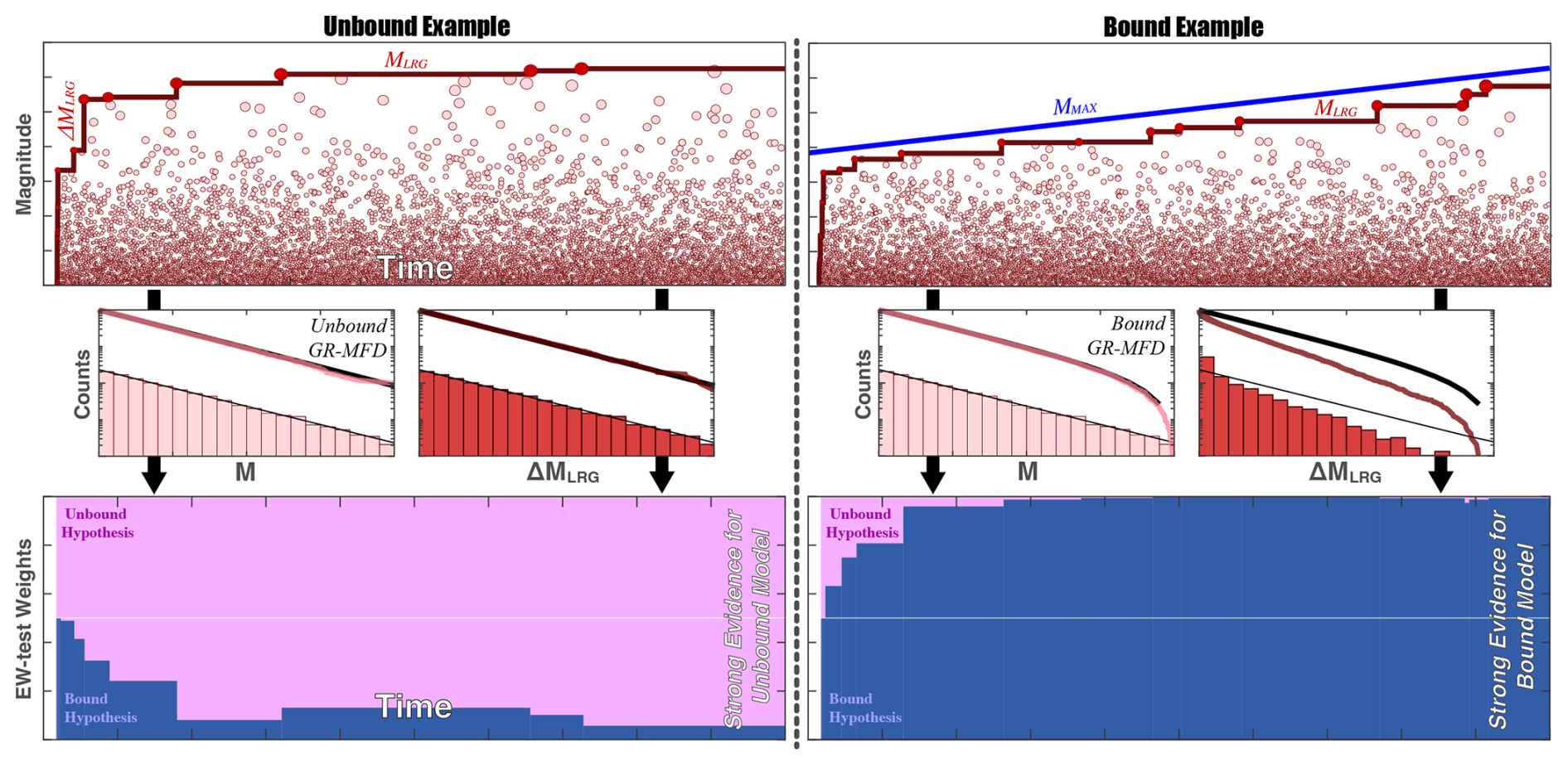 Figure 2Schematic demonstration of the EW-test. The upper panels show hypothetical catalogues of earthquakes. Earthquake magnitudes (M, pink circles), the sequence of largest events (MLRG, red line), and jumps in the largest event magnitudes (ΔMLRG) can be directly observed. Potentially, some unobservable physical process could be bounding these catalogues (MMAX, blue line). Left and right panels detail contrasting concepts for a bound and unbound catalogue, respectively. If there is an MMAX, then it can be statistically inferred from the observables. Middle panels show the differences between distributions of M and MLRG, when bounded by MMAX (or not). The distribution of M follows a GR-MFD: analytical cumulative (thick black line) and non-cumulative (thin black line) agree with numerical cumulative (pink line) and non-cumulative (pink bars) distributions. The distribution of ΔMLRG will differ from the GR-MFD when bounded by MMAX. Bottom panels show the results of EW-tests using these concepts. Weights of two hypothesized models, an unbound MMAX (pink area) and a bound MMAX (blue area), change as new values of MLRG are observed. EW-tests can quickly infer the presence of the true MMAX model, from the equivocal a priori assumption (white horizontal line).