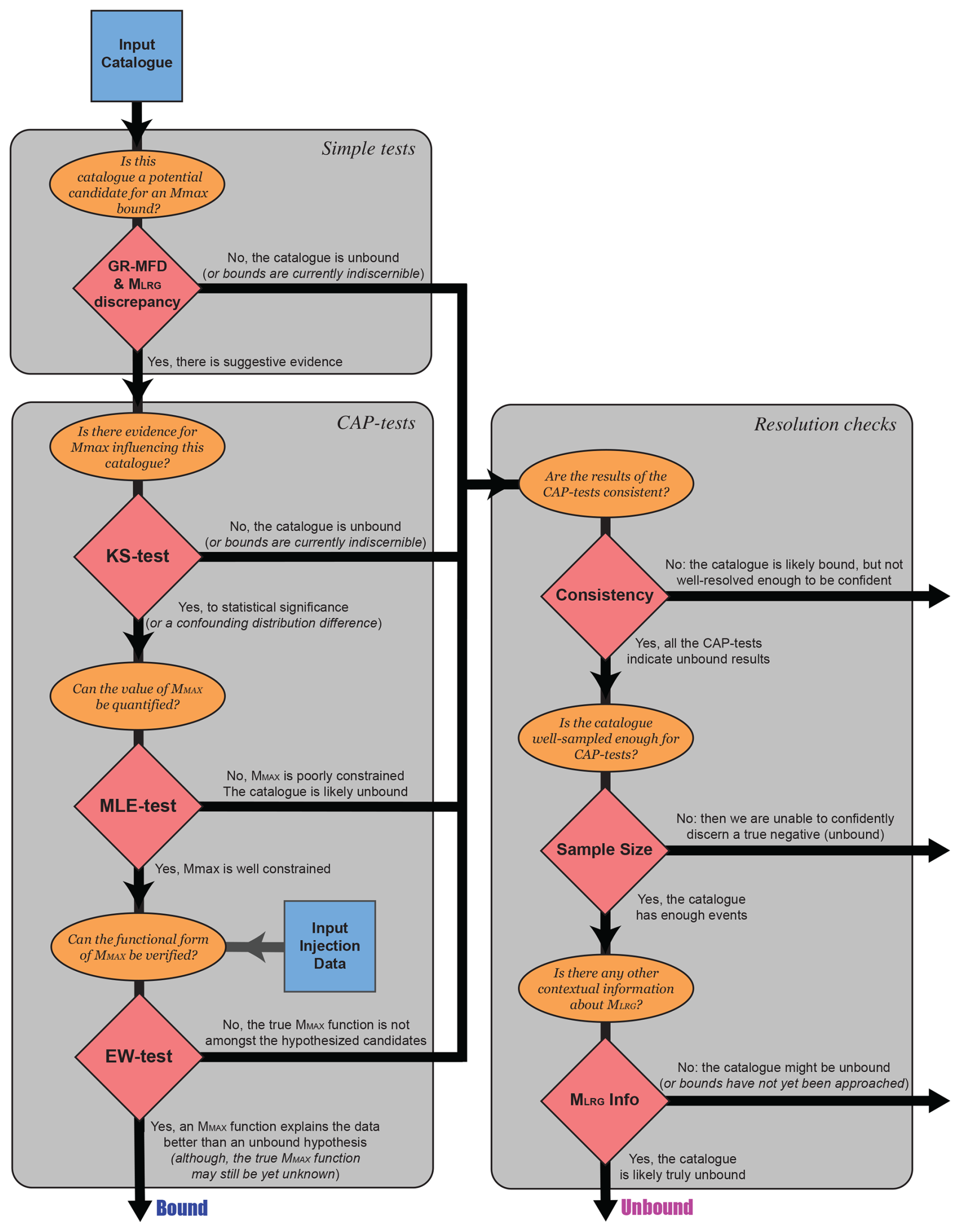 The methods of this paper concern the robust inference and estimation of MMAX from a catalogue of earthquakes. To do so, we have composed a suite of statistical tests. First, simple-tests can be used to pre-screen cases and provide qualitative or semi-quantitative inferences of MMAX bounds. Candidate catalogues can then be examined more deeply using CAP-tests, which use a series of statistical tests to robustly discern the presence of MMAX and quantify the best model hypothesis. Last, we outline criteria for assessing the absence of MMAX. These tests are used to logically guide interpretations amongst the three possibilities: that MMAX bounds a catalogue, that MMAX is not bounding a catalogue, or that the catalogue is not well-resolved enough to make an interpretation either way. An overview of this workflow's logical sequencing has been provided (Fig. 1).
