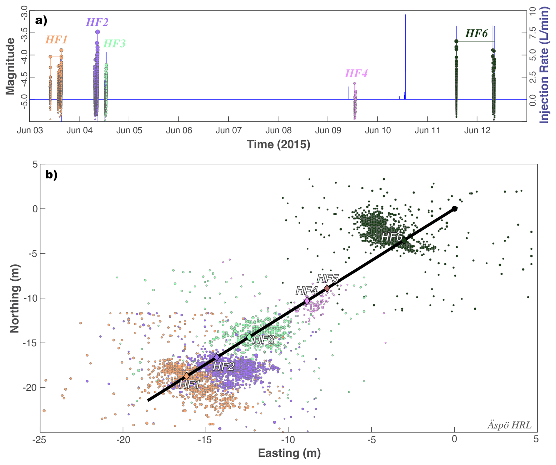 Figure 4Hydraulic stimulation and earthquake response at the Äspö HRL. (a) Timings and injection rates of six stages (blue line) are compared against induced earthquake magnitudes (circles). (b) Locations of six stages (diamonds; HF1-HF6), along the well bore (black line), and the resultant earthquakes (circles). Injection stages and corresponding earthquakes are colour coordinated in all panels.
