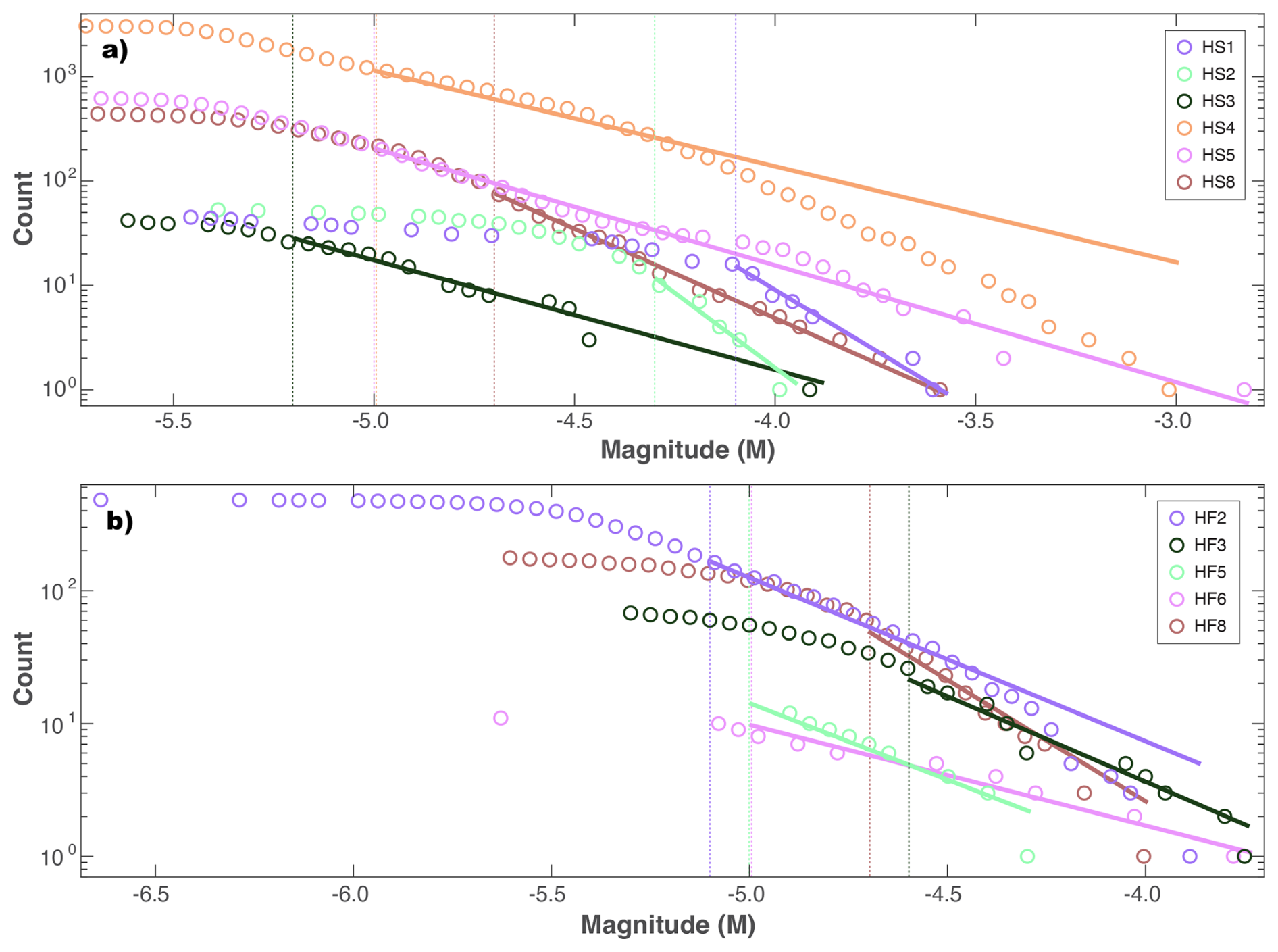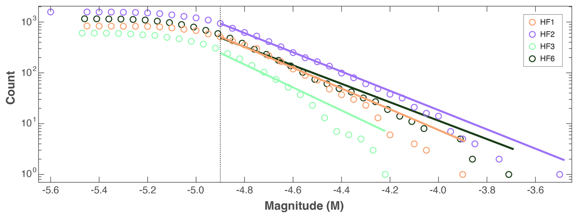 Figure 5Simple magnitude statistics for the Äspö HRL. GR-MFD of cumulative events (circles), alongside best fit to the data (solid lines) and the magnitude-of-completeness (dashed line). Data is colour coordinated according to injection stages (i.e., HF1–HF6).