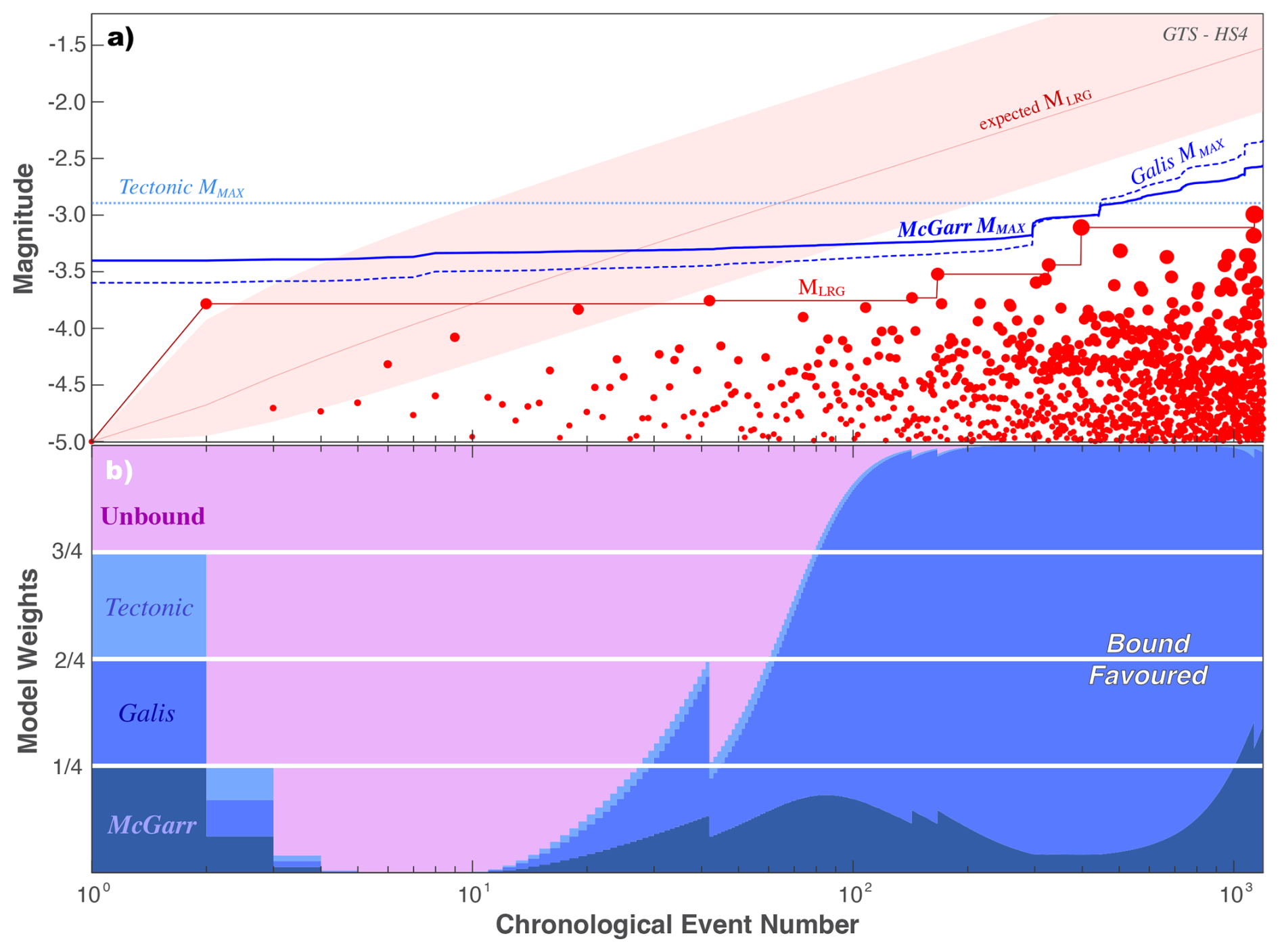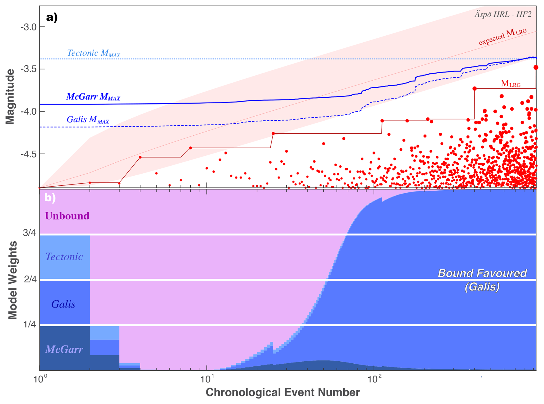 Figure 6Using the EW-test to discern between MMAX models for HF2 at the Äspö HRL. (a) The chronological sequence of earthquake magnitudes (red circles), the observed MLRG (red line), and the expected MLRG at the 10/50/90 percentiles (red area) are compared against MMAX hypotheses (blue lines). (b) The corresponding ensemble weights update as new data is encountered.