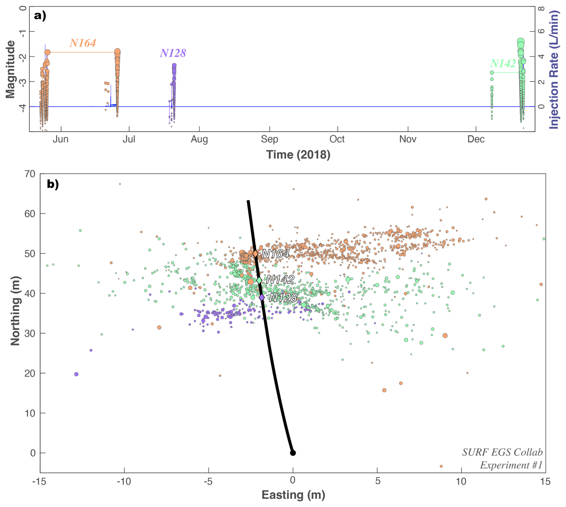 Figure 7Hydraulic stimulation and earthquake response for SURF Experiment #1. (a) Timings and injection rates of three stages (blue line) are compared against induced earthquake magnitudes (circles). (b) Locations of three stages (diamonds; N164, N142, N128), along the well bore (black line), and the resultant earthquakes (circles). Injection stages and corresponding earthquakes are colour coordinated in all panels.