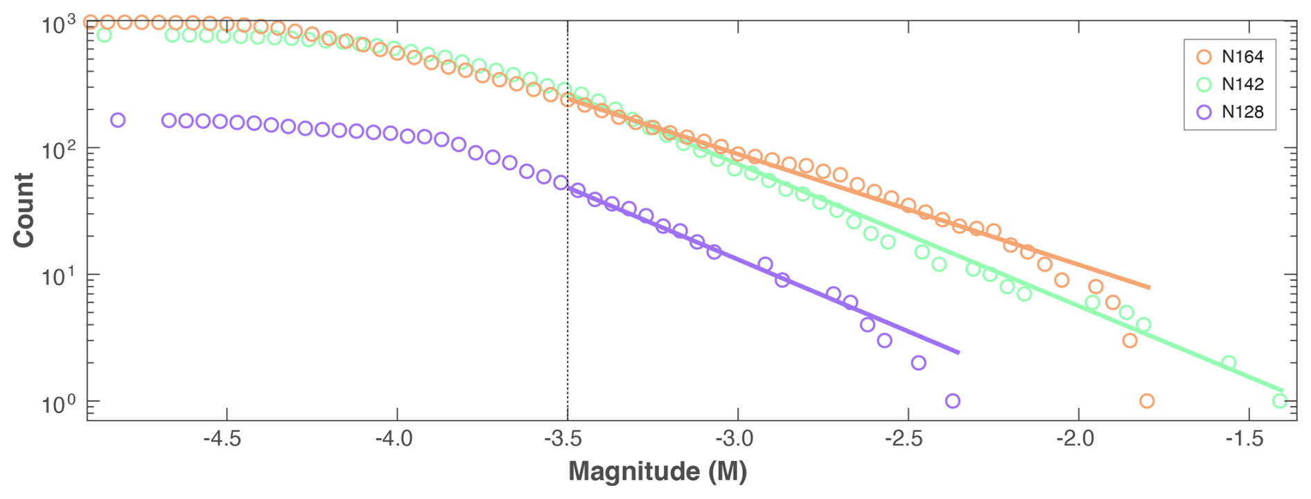 Figure 8Simple magnitude statistics for SURF Experiment #1. GR-MFD of cumulative events (circles), alongside best fit to the data (solid lines) and the magnitude-of-completeness (dashed line). Data is colour coordinated according to injection stage (i.e., N164, N142, N128).