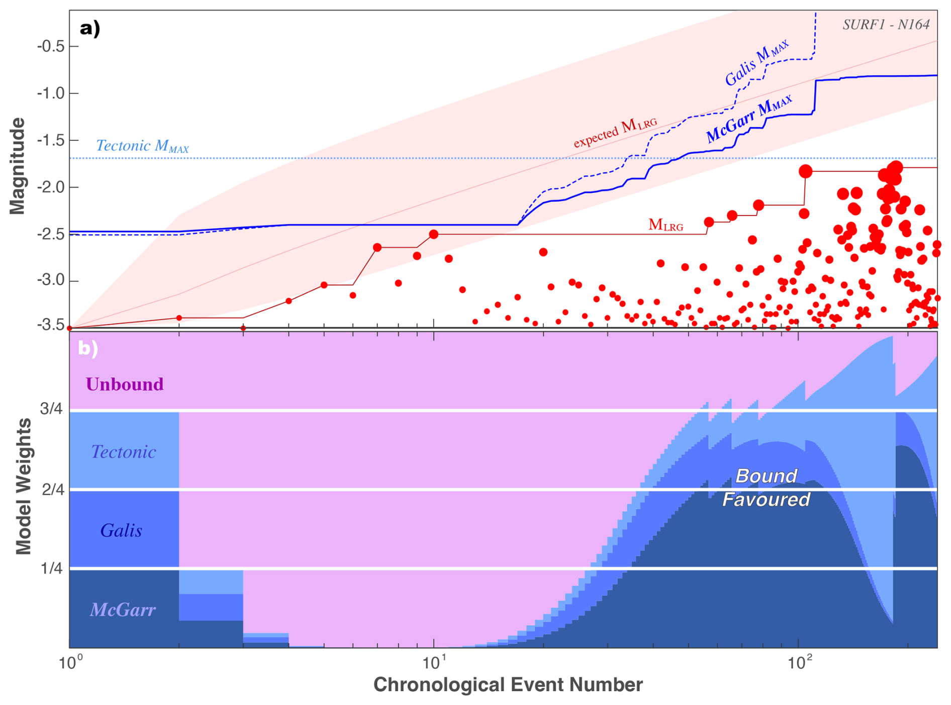 Figure 9Using the EW-test to discern between MMAX models for N164 for SURF Experiment #1. (a) The chronological sequence of earthquake magnitudes (red circles), the observed MLRG (red line), and the expected MLRG at the 10/50/90 percentiles (red area) are compared against MMAX hypotheses (blue lines). (b) The corresponding ensemble weights update as new data is encountered.