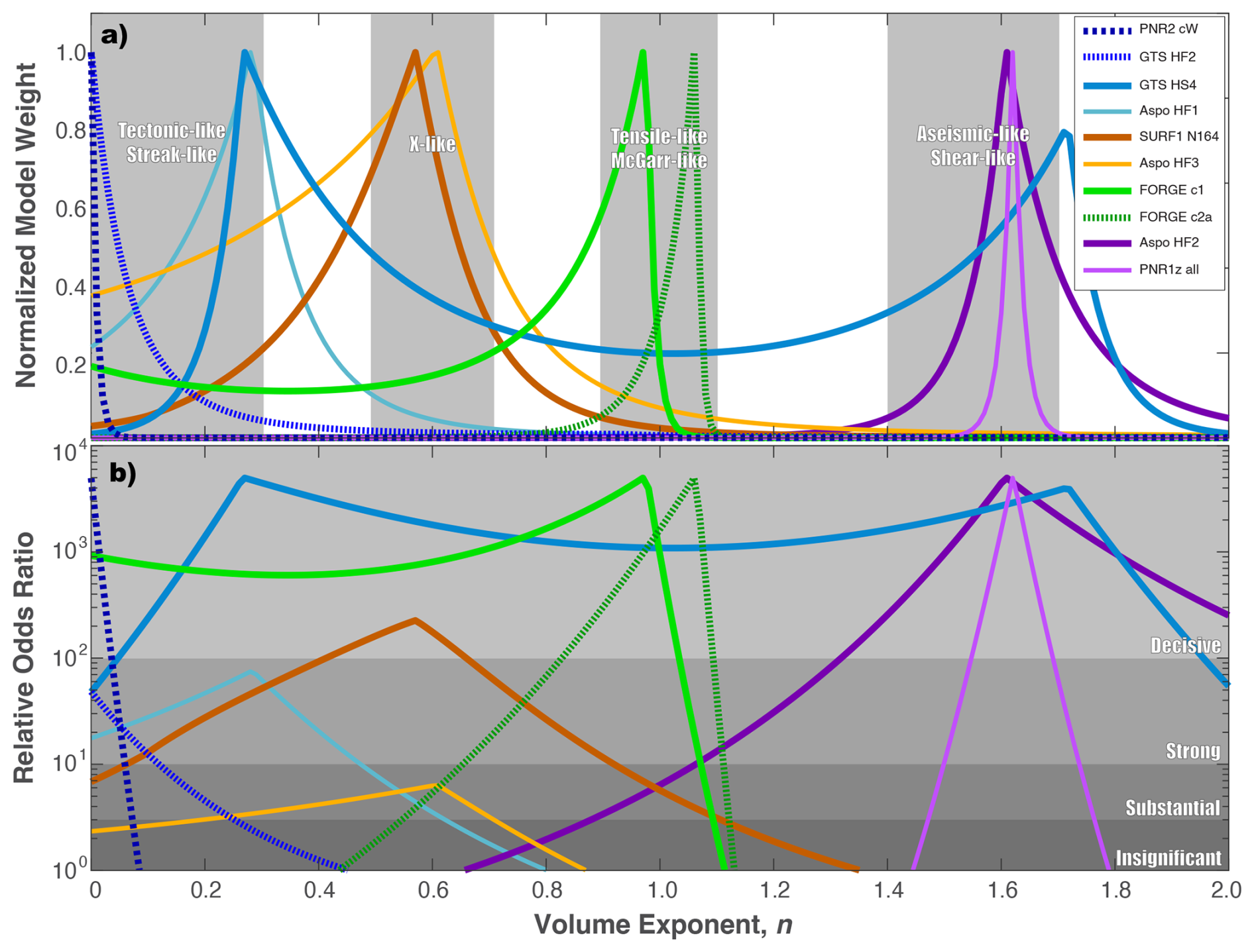 The EW-test starts by considering an ensemble of proposed MMAX models to explain the catalogue data (Schultz, 2024). Using the previously defined log-likelihood function, both Akaike Information Criterion (AIC) and Bayesian Information Criterion (BIC) can be defined for each MMAX model (Schwarz, 1978; Akaike, 1998); note that we have used the small sample size corrections for AIC/BIC (Sugiura, 1978; McQuarrie, 1999). Next, we compute the differences in AIC/BIC scores, by subtracting the score of the best MMAX model. These score differences can be translated into relative model weights by an exponential function (Wagenmakers and Farrell, 2004). We combine AIC/BIC weights into a single weight by taking an average between the two. In this study we will consider four standard MMAX models: McGarr-like (i.e., log-proportional to injected volume; MMAX∝log 10(V1)) (McGarr, 2014; Hallo et al., 2014; Elsworth et al., 2025), Galis-like (i.e., MMAXlog10V3/2) (Galis et al., 2017), a constant tectonic upper bound (Kanamori and Anderson, 1975), and the unbound null hypothesis. The unbound null hypothesis consists of three model parameters (Mc, b-value, GR-MFD variance), while all bound models have one additional model parameter (i.e., K=4) to account for the slope of the volume-based relationship.