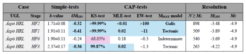 Based on this need, CAP-tests were designed as a suite of statistical tests to infer and quantify the presence of MMAX within a catalogue of data. Specifically, this approach compares the distribution of earthquake magnitudes (M) against the distribution of jumps in the largest magnitude events (ΔMLRG): when they are the same distribution, the catalogue is unbound and there is no MMAX (and vice versa) (Schultz, 2024). Synthetic testing suggests that this problem reformulation can be more sensitive to MMAX than traditional approaches (Schultz, 2024, 2026a). CAP-tests are broken into three component parts: the KS-test (Kolmogorov-Smirnov test) as a hypothesis test to infer the presence of MMAX, the MLE-test (Maximum Likelihood Estimation test) to quantify the value of MMAX, and the EW-test (Ensemble Weighting test) to select the theoretical MMAX model that explains the catalogue data best. We provide the full methodological details of CAP-tests in Sect. 2.